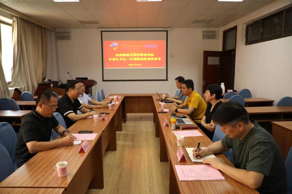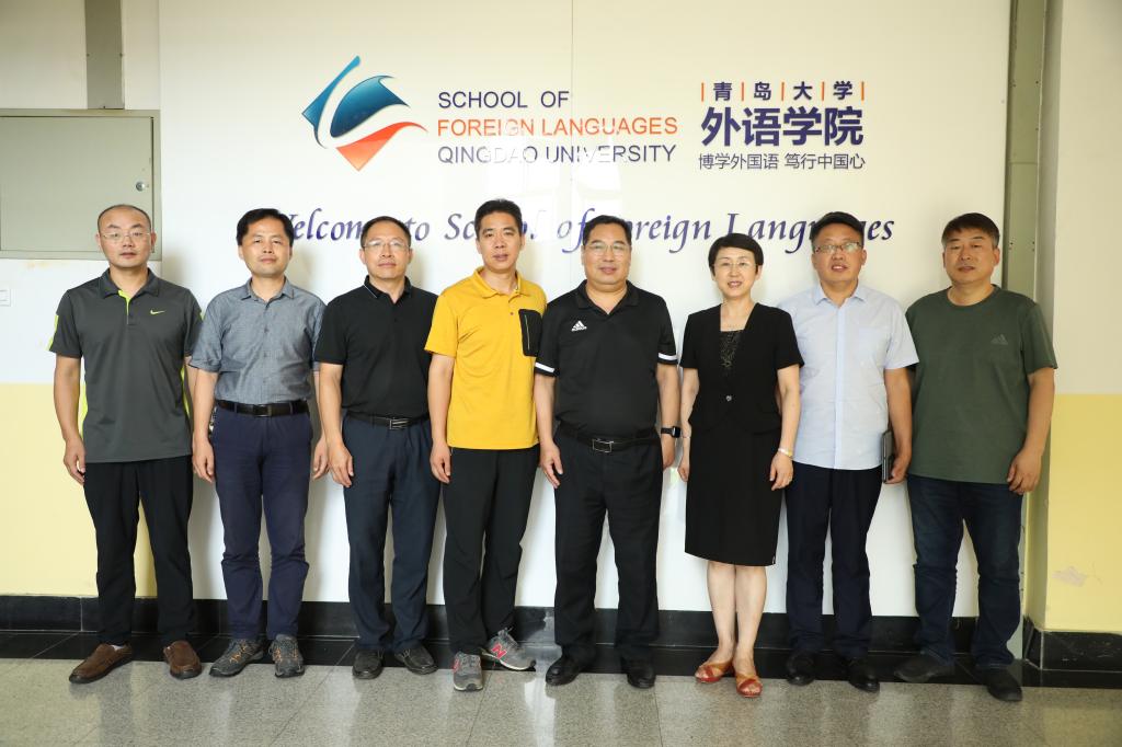 7月9日上午,聊城大学外国语学院党委书记齐登红教授、科研副院长刘风山教授、教学副院长李维滨教授一行四人莅临我院调研指导。外语学院党委书记王传永、院长卞建华、副院长布占廷、娄永强参加调研交流。
