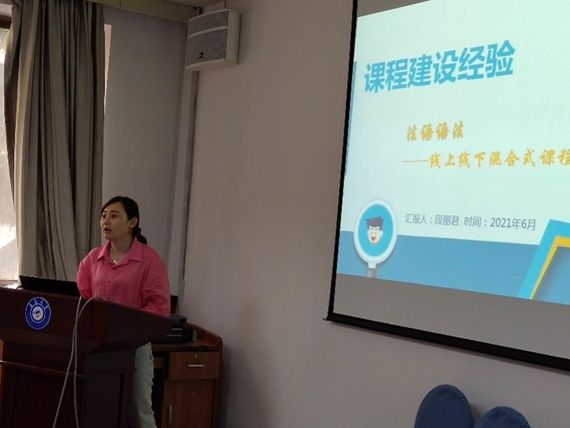 段丽君主任结合自己混合式一流课程申报经历从课程选择、线上平台、线下课程与资料积累四个方面分享了自己混合式课程建设经验,展示了自己在国家级一流本科课程建设和申报中遇到的技术难题和解决方法,提醒老师们积极利用“中国大学慕课”平台的优质资源,实施线上线下混合式的教学模式,为学生提供丰富充足的学习资源和自主学习机会。