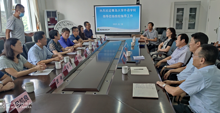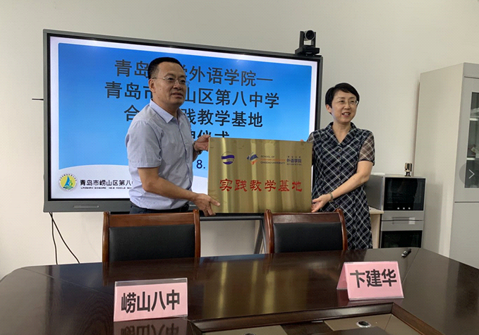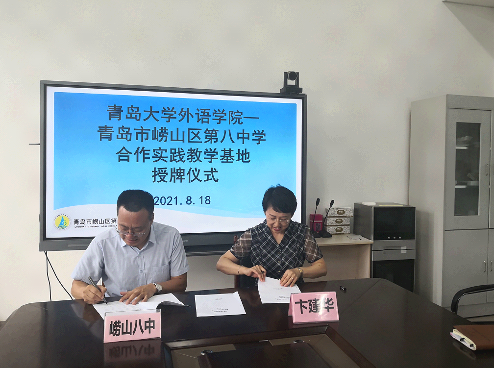8月18日下午,外语学院在崂山八中举行“青岛大学外语学院实践教学基地” 揭牌仪式。院长卞建华、副院长布占廷、娄永强,英语教育系主任黄芳、副主任王进福、宋蕾、吕凯良、贾伟,党政办主任华登峰、崂山教体局总督学张清海、崂山区教体局副局长孙咏梅、崂山八中校长肖世强、副校长江昊世和八中外语组骨干教师参加仪式。双方进行了会谈并签署合作协议,仪式由张清海主持。