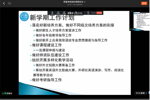 会议将上学期总体工作总结为“一条主线、两个重点、三个亮点”,并从教学、科研和内部建设等方面介绍了英语系上学期的主要工作,表扬了表现突出的教师。随后对新学期工作进行安排布置,介绍了新学期教学任务、班主任工作、课程安排等方面的具体目标与任务,并指出新学期教学工作的重点难点。