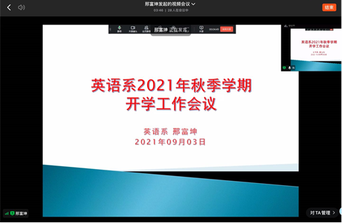 9月3日上午,外语学院英语系召开2021年秋季学期开学工作会议,总结全系上学期工作,布置新学期教学任务,会议由邢富坤主任主持,全系教师参加。