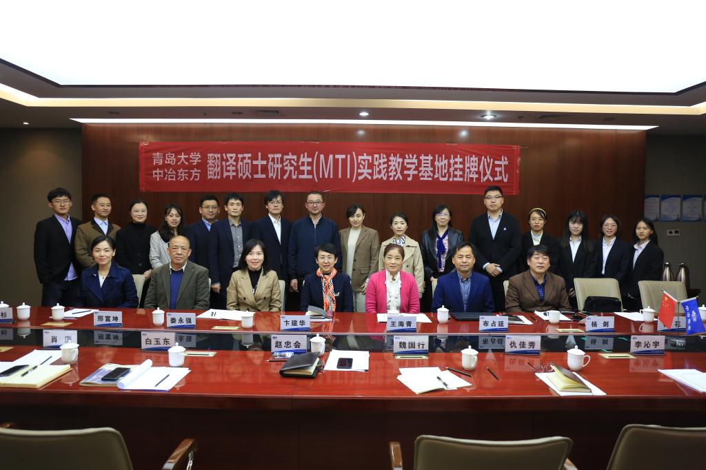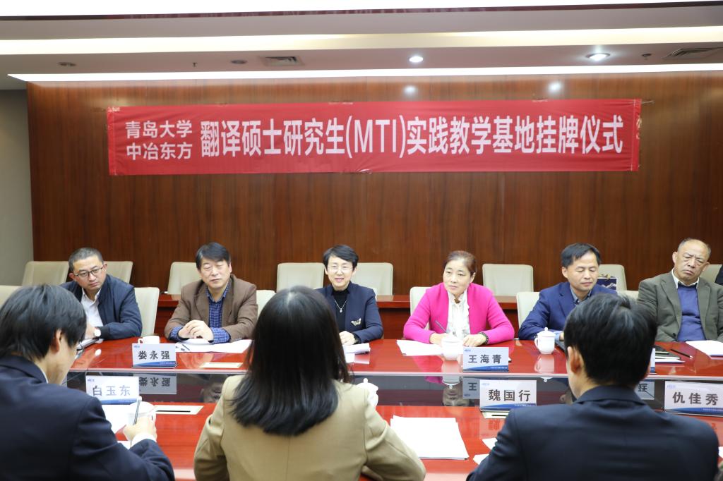 10月22日下午,外语学院与中冶东方工程技术有限公司(以下简称中冶东方公司)翻译中心MTI实践教学基地揭牌仪式在西海岸新区中冶东方大厦举行。院长卞建华、党委副书记王海青、副院长布占廷、娄永强、院长助理曹杉和各教学系代表参加了仪式。仪式由中冶东方公司翻译中心主任、我院校外兼职导师赵忠会主持。