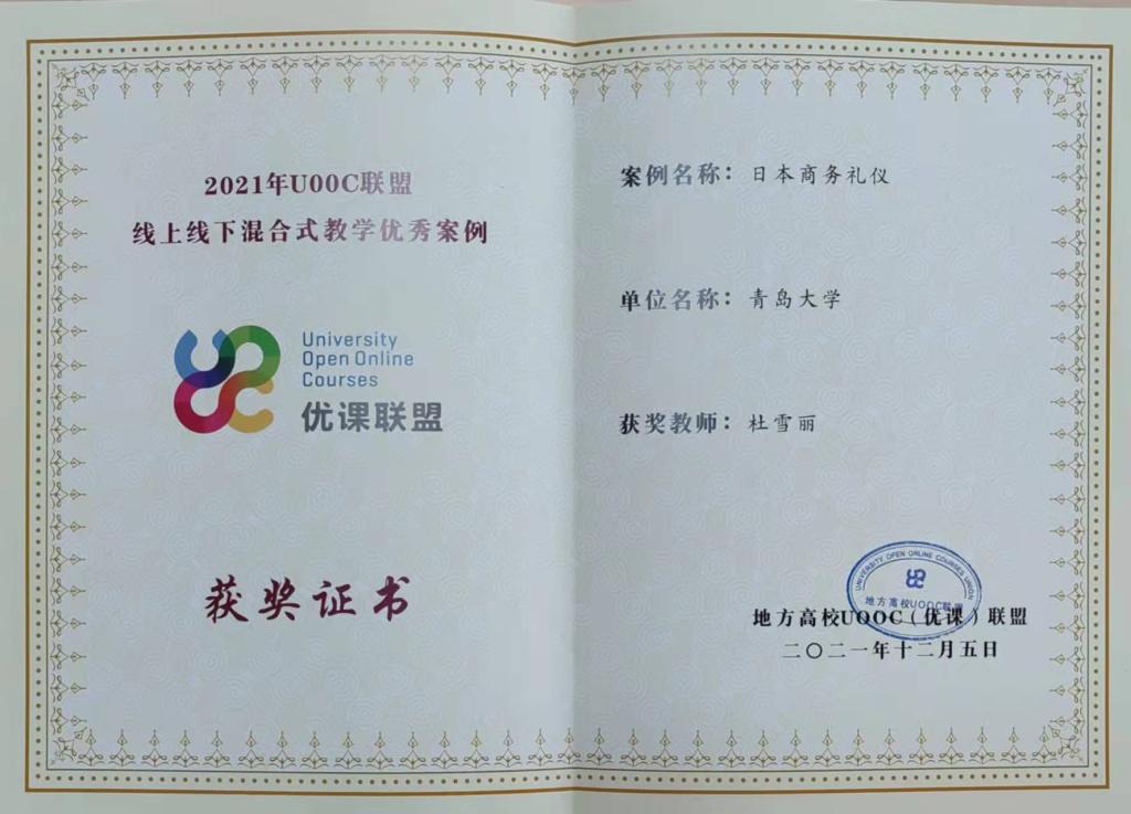 近日,在2021年地方高校UOOC(优课)联盟(简称“UOOC联盟”)“慕课与混合式教学优秀案例”评选中,外语学院日语系杜雪丽老师主讲的线上课程“日本商务礼仪”,被评为线上线下混合式教学优秀案例。