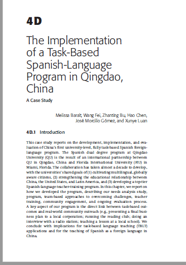 近期,我院教师王斐、布占廷、陈皓、栾勋业与佛罗里达国际大学(FIU)教师Melissa Baralt, José Morcillo Gómez在The Cambridge Handbook of Task-Based Language Teaching(《剑桥大学任务型语言教学手册》)合作发表论文The Implementation of a Task-Based Spanish-Language Program in Qingdao, China(《基于任务的西班牙语教学项目:以中国青岛大学为例》)。