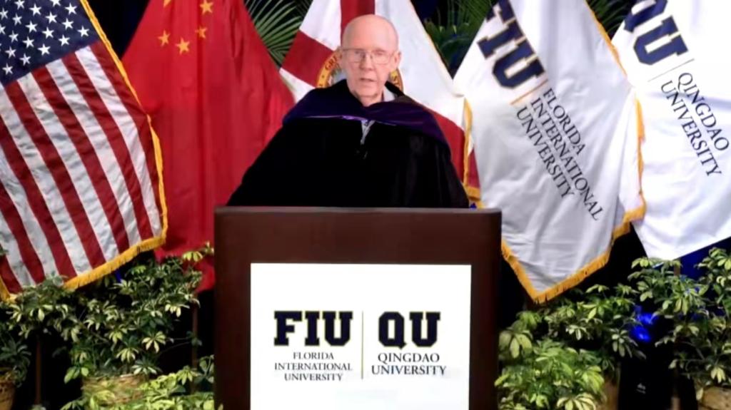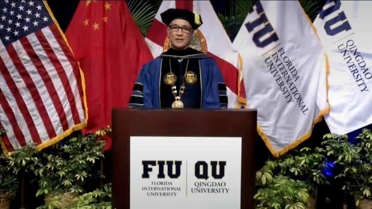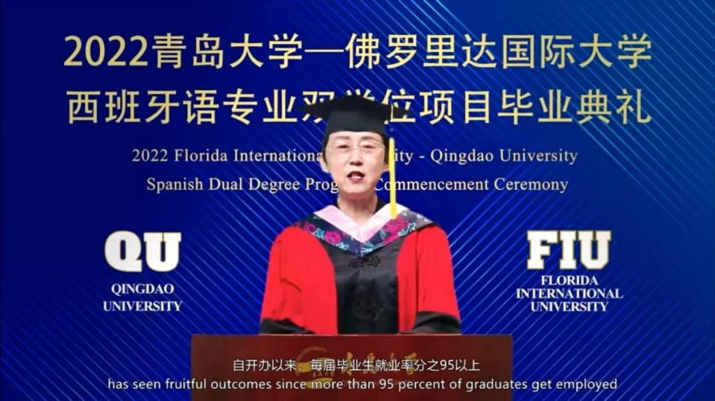 佛罗里达国际大学代理校长肯尼思·杰塞尔、青岛大学校长夏东伟、青岛大学外语学院院长卞建华、佛罗里达国际大学史蒂夫·格林国际和公共事务学院院长约翰·斯泰克等领导嘉宾先后致辞,2022届全体毕业生参加本次典礼。