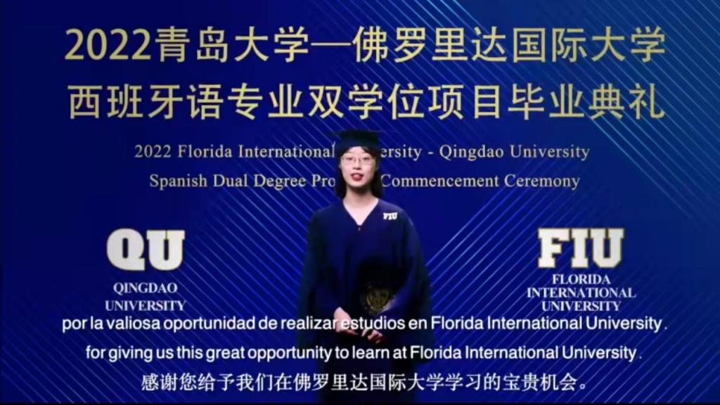2022年5月31日上午9:00,青岛大学—佛罗里达国际大学西班牙语专业双学位项目第五届毕业典礼暨学位授予仪式在云端成功举办,外语学院59名中外合作西班牙语毕业生获得佛罗里达国际大学学士学位。