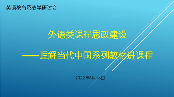 2022年8月16日下午,英语教育系就“理解当代中国”系列教材进课程这一议题召开专题教学研讨会。会议由黄芳主任主持,外语学院娄永强副院长、布占廷副院长以及英语教育系相关课程的骨干教师参加了研讨。