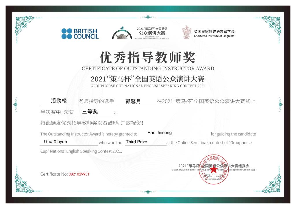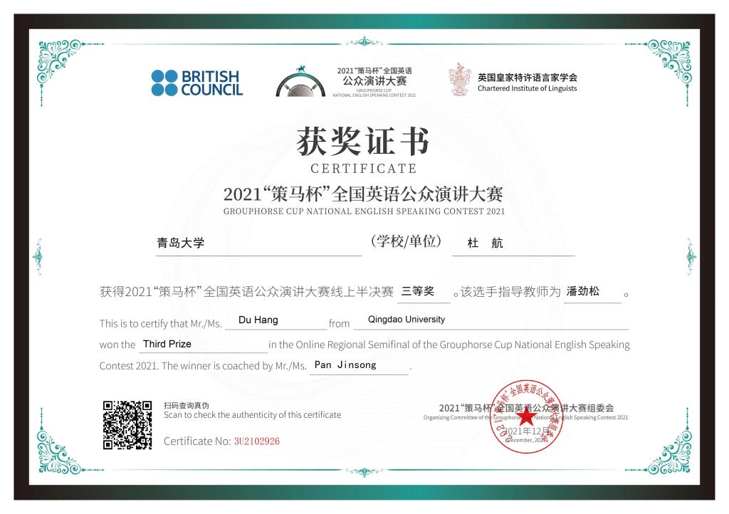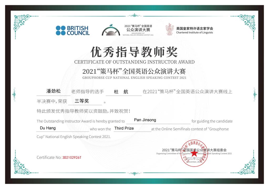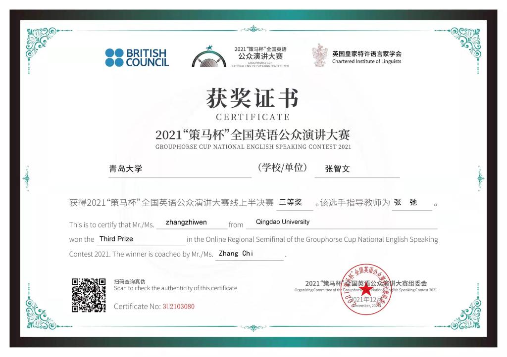 2021“策马杯”全国英语公众演讲大赛半决赛日前结束,我院英语系张智文、杜航和郭馨月三名同学分别通过线上和线下两个赛道,经过初赛、复赛、大区赛、大区复赛和半决赛的层层闯关,从全国几千名选手中脱颖而出,获得三等奖(全国排名前25)的优异成绩。英语系的潘劲松和张驰两位老师获得优秀指导教师奖。