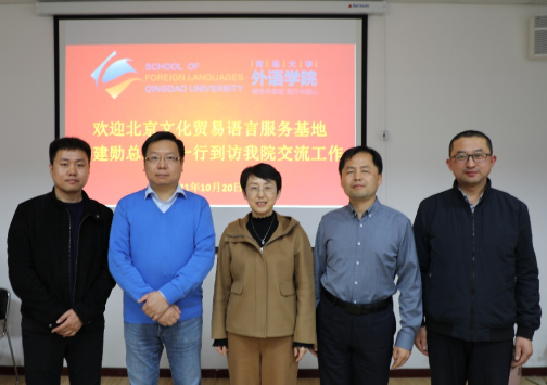卞院长对李建勋一行人来到外语学院表示热烈的欢迎,并简要介绍了学院的教学科研情况。李建勋经理介绍了北京文化贸易语言服务基地所涉及的翻译服务项目、社会实践等,并希望能够与青岛大学在学术研讨、教师培训、学生实习实践等方面建立多层次的合作。