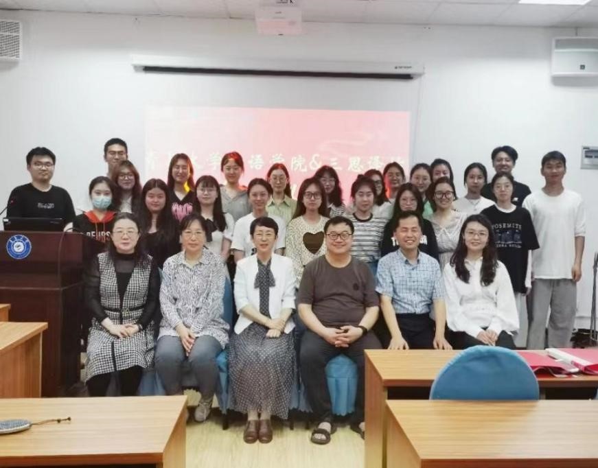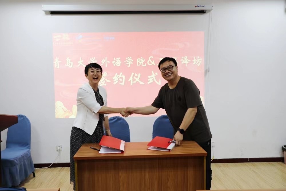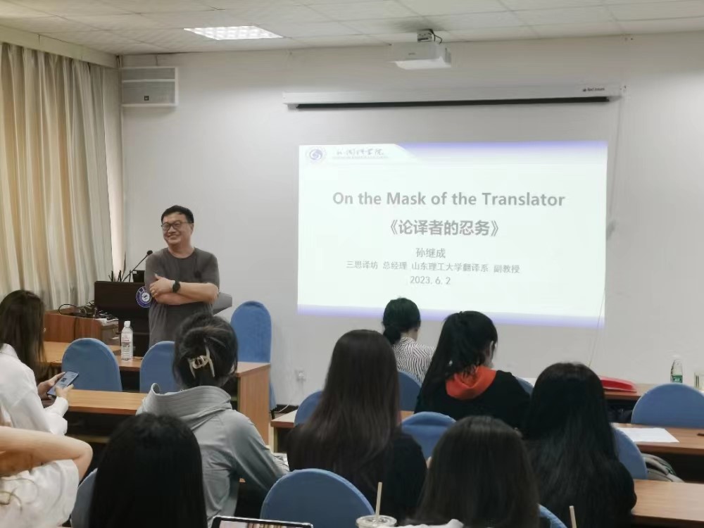 2023年6月2日,青岛大学外语学院和山东省翻译协会理事单位三思译坊共同成立的“联合翻译实训基地”举行合作签约仪式。三思译坊总经理、山东理工大学翻译系孙继成教授,青岛大学外语学院院长卞建华、副院长布占廷、英语系主任吕云、石灿老师出席签约仪式。仪式由青岛大学外语学院副院长宫英瑞主持。随后,孙继成教授为青岛大学外语学院师生带来主题为“On the Mask of Translator 《论译者的忍务》”的学术讲座。讲座中,孙教授从“译事惊喜”、“从译惊历”、“译者待遇”三部分展开,向大家讲述了自己作为一名译者、学者和团队领导者的切身经历,并告诫大家在团队工作中既要注重与同伴沟通,荟聚合力创造价值,也要学会与“技能工具”协作,各取所长提高效率。最后整个讲座在一片掌声中完美结束。