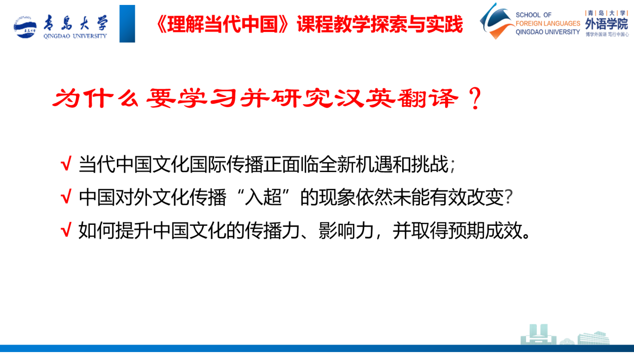 接下来,卞建华教授结合学院“汉英翻译”和“英语演讲课程教学探索与实践”课程教学经验,并选取部分学生课堂翻译案例和外语演讲备赛案例,展示了外语学院专业课程思政融合的最新教学成果。在今后的外语教学实践中,学院将继续依托《理解当代中国》系列教材,进一步加强学生的资料检索、翻译实践及语言生动呈现能力,同时将利用本校资源,联络国际留学生,做目标读者和听众分析问卷,邀请目标受众代表参加现场课堂教学、阅读翻译文本、倾听英语演讲,进行反馈互动,以教促研,以研促教,促学。