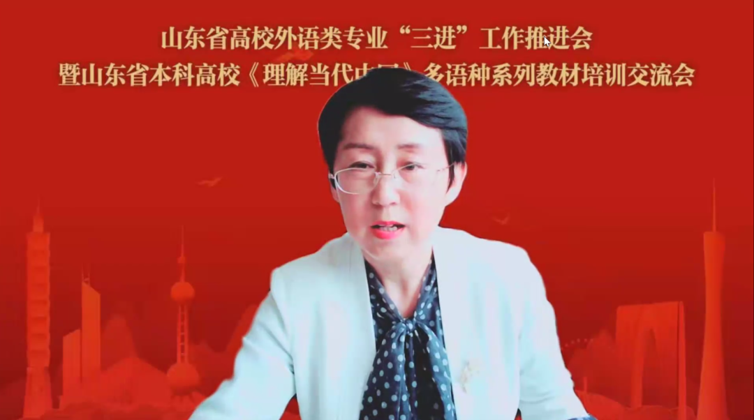 2023年6月16日,山东省高校外语类专业“三进”工作推进会举行。本次工作会由山东省教育厅高等教育处主办、山东大学外国语学院承办、外语教学与研究出版社协办。山东省教育厅高等教育处相关负责人、本科高校教务处负责人、外语院系负责人和一线教师共计400余名共聚云端,共探思政育人新路径。我院卞建华教授在教学实践分享环节作了题为“《理解当代中国》——汉英翻译/英语演讲课程教学探索与实践”的报告。