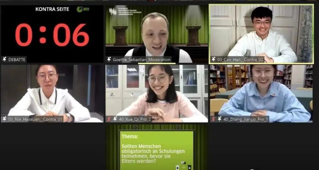 全国高校德语辩论赛是全国高校德语学科点本科生的重要传统赛事,自2007年创办以来已经成功举办过12届。此届全国高校德语辩论赛首次尝试以纯线上方式举办,并通过微博方式现场直播,引起全国高校德语学科点的高度关注,微博平台点击量突破2万多人次。线上直播这一新方式同时带来了比赛规则的创新。本届比赛首次启用事先不公布具体辩题,仅只公布辩题涉及领域的新规则,辩题和立场由选手线上检录后随机抽取,加大了赛事的难度以及挑战性。抽取辩题和立场后,距选手登场亮相仅有短短10分钟时间。他们必须以最快速度完成资料查找、论据梳理、策略沟通和语言组织,做好上场前的一切准备。这样一来,选手不仅要有过硬的德语表达能力,并且要具备极强的快速学习能力、敏锐的判断分析能力、缜密的逻辑思维能力和熟练的辩论技巧。这无疑大大增加了比赛的难度和悬念,整个过程扣人心弦。