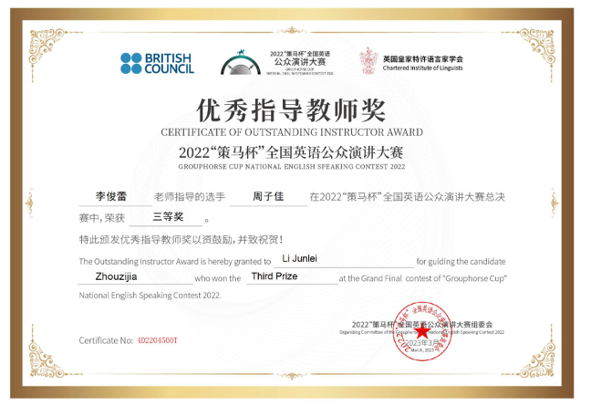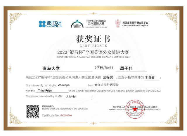 2023年3月19日“策马杯”全国英语公众演讲大赛全国总决赛圆满落下帷幕,我院学子2021级英语系语言大数据创新实验班周子佳同学在全国总决赛中获得三等奖的成绩。