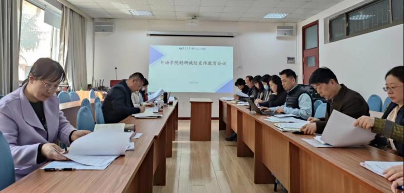 为持续加强科研诚信建设,构建风清气正的学术风气,3月20日上午,外语学院召开科研诚信宣传教育会议。学院党政班子成员及各学科负责人参加了此次会议,就教职员工及研究生的科研诚信意识、学术规范理念、论文发表和科研成果管理等方面展开了深入讨论。