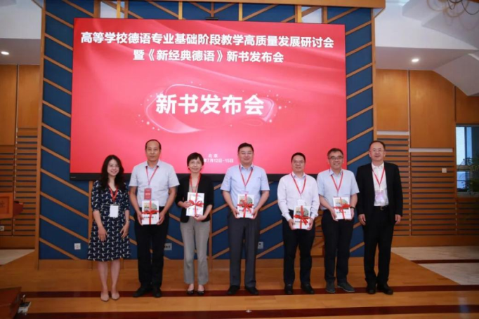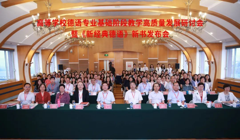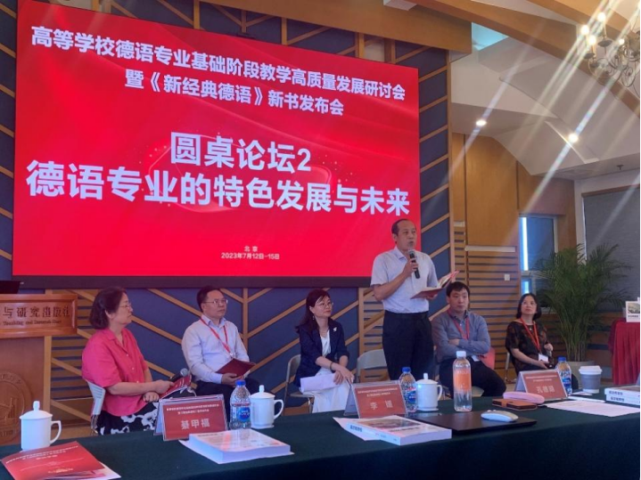 7月13-14日,“高等学校德语专业基础阶段教学高质量发展研讨会暨《新经典德语》新书发布会”在北京顺利召开。本次会议由北京外国语大学、教育部高等学校外国语言文学类专业教学指导委员会德语专业教学指导分委员会全国德语教师发展中心共同主办,外语教学与研究出版社承办。来自全国40多所高校的100余名德语教育专家、学者与一线教师齐聚一堂,共同探讨高校德语专业基础教学与发展的新方向、新教材、新征程,分享教学成果与实践经验,助推德语教育教学高质量发展。我院德语系主任綦甲福教授和刘惠宇老师应邀参加会议,在圆桌论坛和专题报告环节与全国德语教师进行探讨与交流。