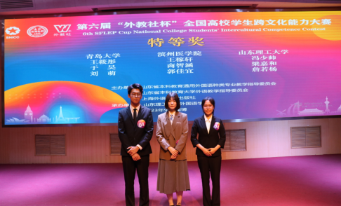 9月23日至24日,第六届“外教社杯”全国高校学生跨文化能力大赛山东赛区复赛和决赛在淄博举行,由我校公共外语教育学院王海峻、秦丹雪和外语学院吕凯良担任指导教师,由我校外语学院学生王筱彤、于昊和师范学院学生刘萌组成的青岛大学团队荣获特等奖,晋级国赛。我校被授予优秀组织奖。