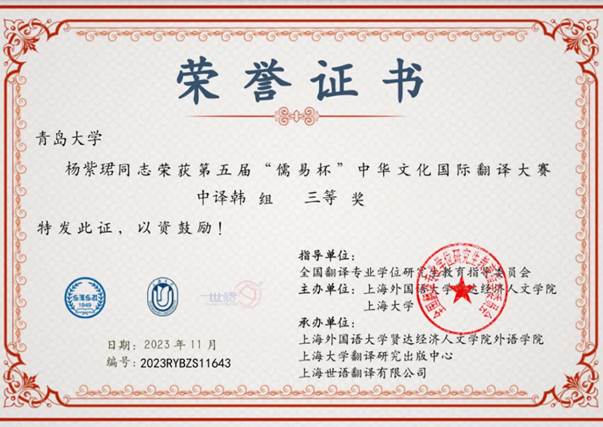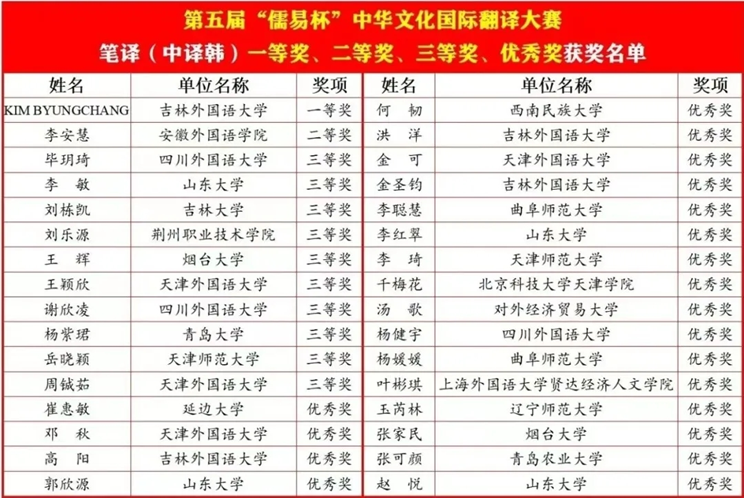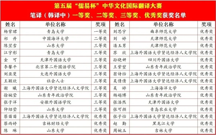大赛评审委员会组织72位专家共进行了三轮匿名评审,线上初评、复评和专家笔译总评,程序严格合规。经过激烈的角逐,我院五名学子取得了优异的成绩,获奖名单如下: