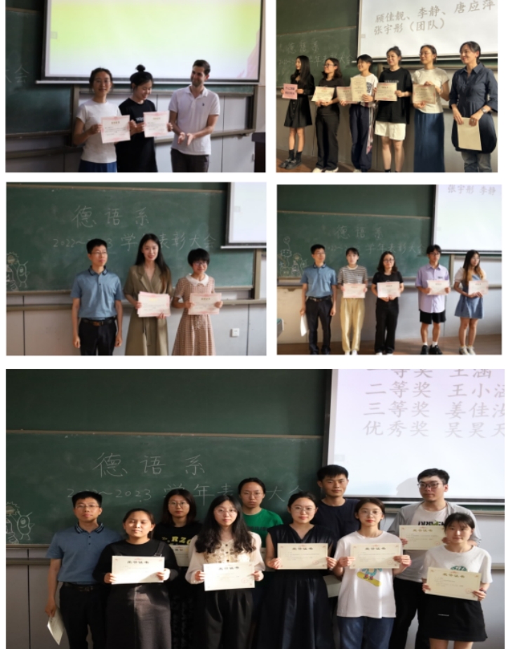 2023年6月15日,青岛大学外语学院德语系在博文楼219阶梯教室召开了2022-2023学年学生表彰大会。大会由德语系副主任刘沁卉主持,德语系全体教师、本科生及研究生齐聚一堂,已公派出国交流的硕士研究生同学线上参加。
