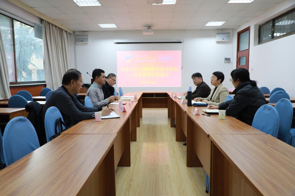 2023年11月23日下午,山东工商学院外国语学院党委书记赵纪新携副院长王国锋、学术委员会主任周树江教授一行三人来学院进行交流。我院院长卞建华、副院长宫英瑞、娄永强参与本次交流。