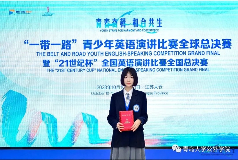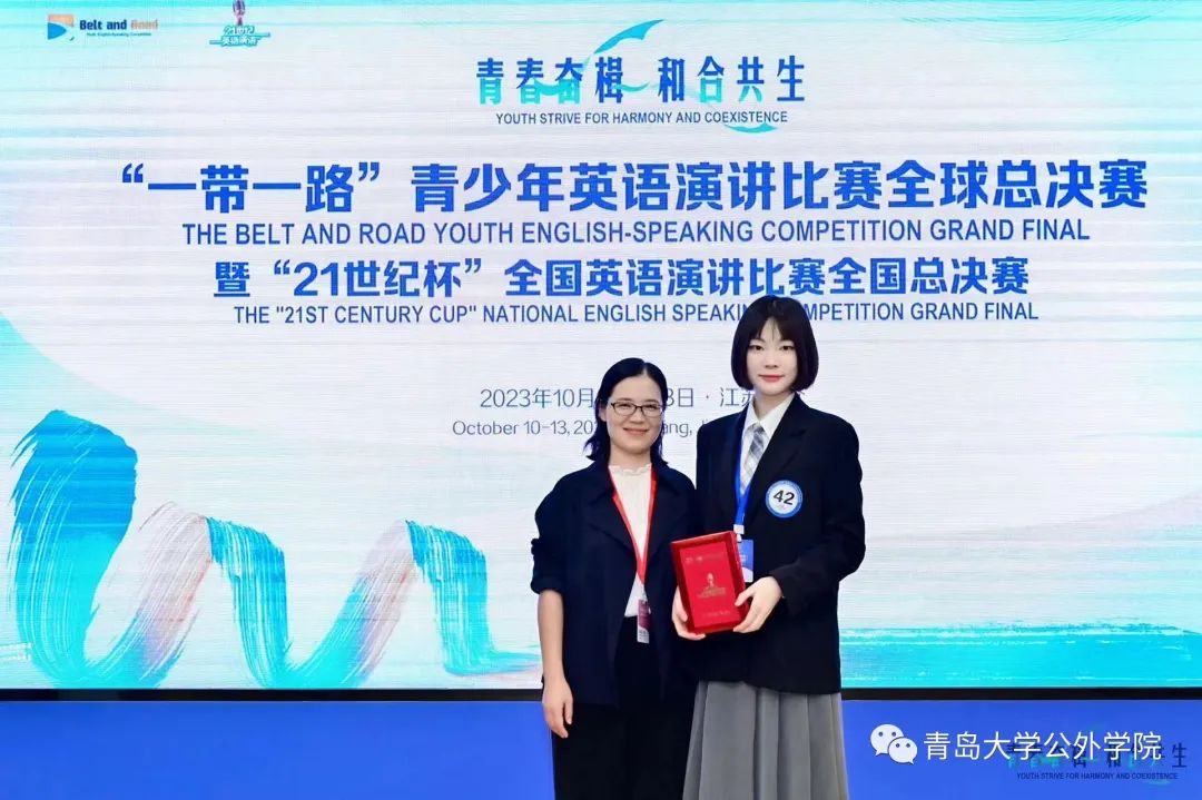 2023年10月11日至13日,第28届“21世纪杯”全国英语演讲比赛全国总决赛在江苏太仓举行。我院德语专业学生王筱彤荣获全国总决赛二等奖,公共外语教育学院教师孙亚楠获得优秀指导教师奖。