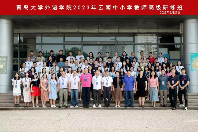 2023年6月26日-7月2日,“云南中小学教师高级研修班”在青岛大学举办。本期研修班由云南省安宁市实验学校教育集团主办,青岛大学外语学院承办。云南省安宁市第二中学、安宁市第一小学、安宁市宁湖小学教师共79名骨干教师以及我校外语学院部分教师和本科生代表参加了此次研修活动。此次高级研修班安排了9场专家报告,内容涵盖教育理念、教学研究、班主任工作、名师教育经验、学科教学方法等主题,邀请了高校知名教授、中小学教学名师、教科院研究员等主讲。参训教师还前往青岛启慧双语学校进行了参观教研。
