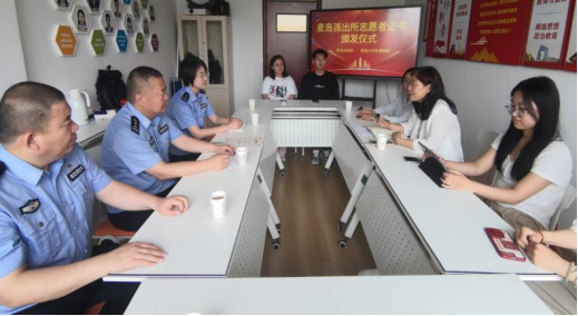 6月13日下午14:00,青岛市公安局崂山分局麦岛派出所所长刘海龙、指导员张娟一行3人来到外语学院,为“外事帮”“译象”团队中的优秀学生志愿者颁发证书,表彰他们在辖区社会治安志愿服务中的突出表现。外语学院党委副书记王海青、研究生辅导员米娟以及部分学生志愿者代表和民警们一起就警、校共建方面座谈交流。