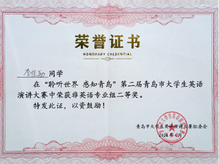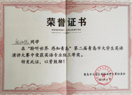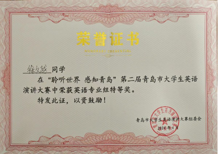 2024年4月27日下午,由青岛旅游集团主办的“聆听世界 感知青岛”第二届青岛市大学生英语演讲大赛决赛暨颁奖仪式在青岛国际会议中心圆满举行。经过前期初赛、复赛角逐,我院共有3名选手入围本届大赛的总决赛,并分别荣获:英语专业组特等奖 徐久越(2023级上合英俄双语创新班,指导教师:牛聪琳)、非英语专业组二等奖 李佳励(2022级外语学院法语1班,指导教师:江美娜)、英语专业组三等奖 张珈恺(2023级语言大数据创新实验班,指导教师:李俊蕾)。我院娄永强、李汝成、李俊蕾三位老师受邀出席了本次大赛决赛暨颁奖仪式。