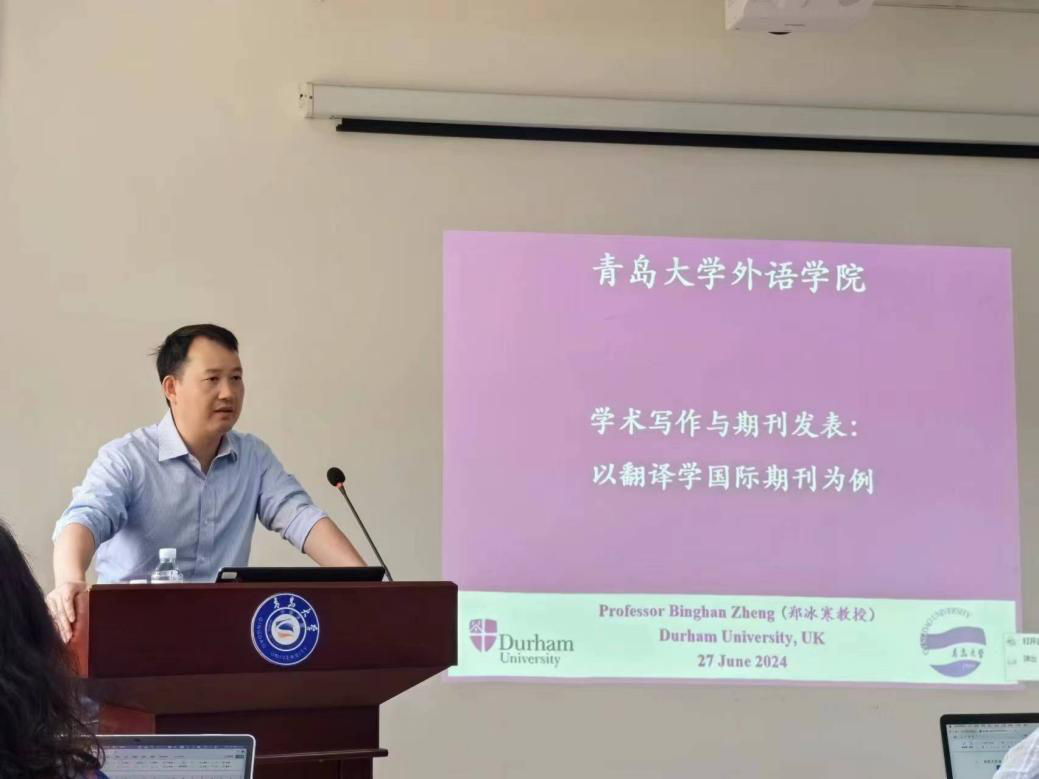 6月27日上午,郑冰寒教授应邀在青岛大学外语学院进行了题为“学术写作期刊发表:以翻译学国际期刊为例”的专题讲座。此次讲座吸引了学院40余名师生,讲座由外语学院院长卞建华教授主持。