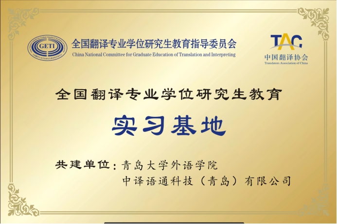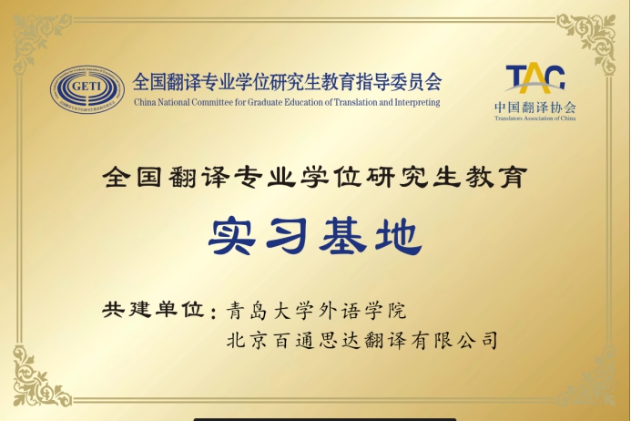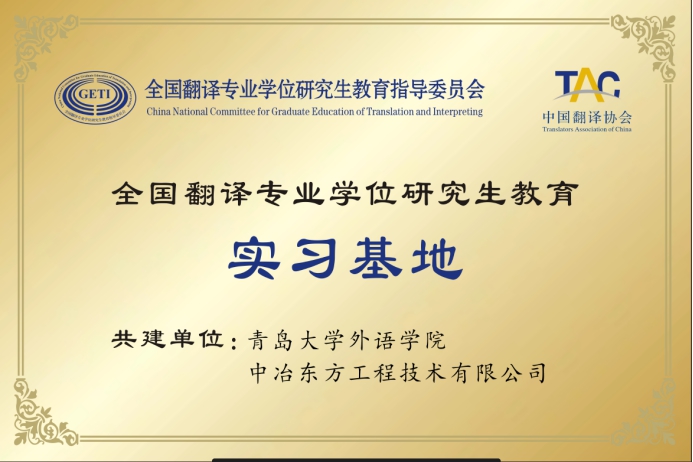 7月5日,中国翻译协会公布名单,由我院申报、中译语通科技(青岛)有限公司、中冶东方工程技术有限公司、北京百通思达翻译有限公司(以下分别简称为青岛中译语通、中冶东方、百通思达)三家单位共建的全国翻译专业学位研究生教育实习基地,经认证委员会评审,顺利通过认证。