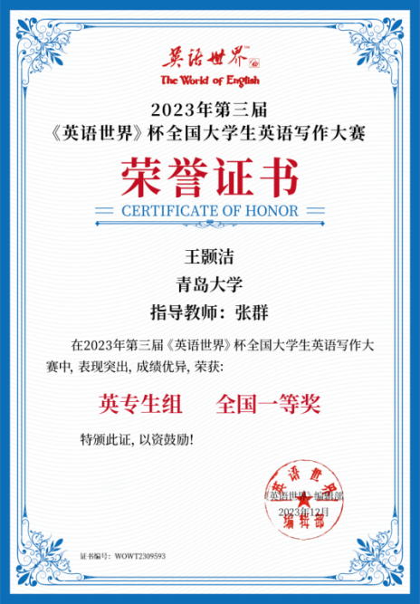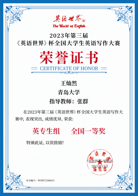 近日,我院学生参加了第三届《英语世界》杯全国大学生英语写作大赛并喜获佳绩。英语系22级王灿然、王颢洁,23级高晓宇三名同学荣获全国一等奖,艾江宇等六名同学荣获全国二等奖,徐梦欣等六名同学荣获全国三等奖,刘雨彤等四名同学荣获优秀奖,青岛大学外语学院荣获“优秀组织奖”。