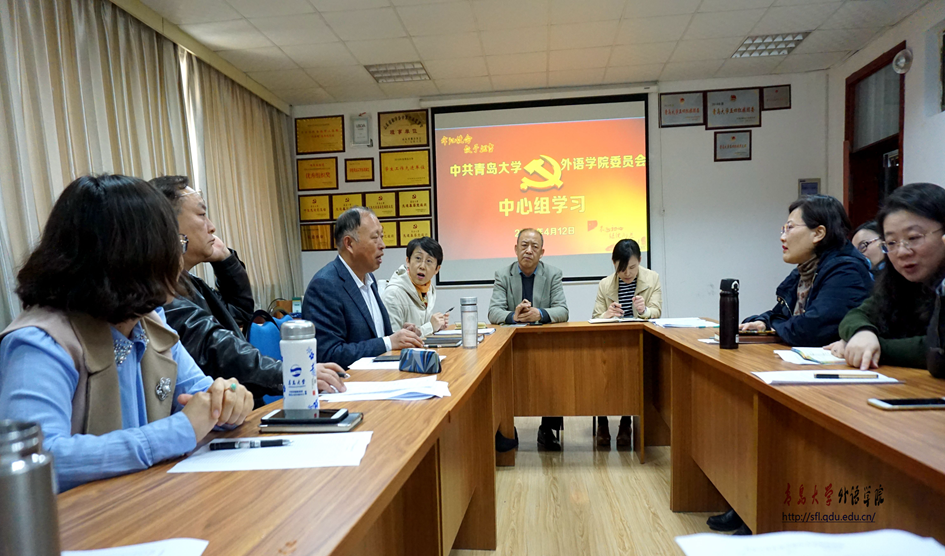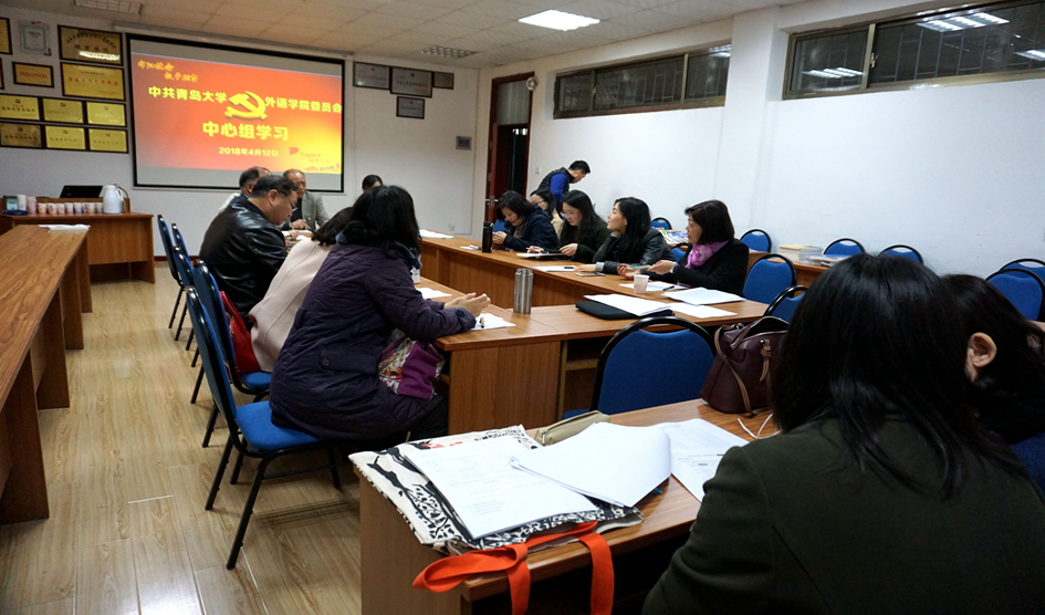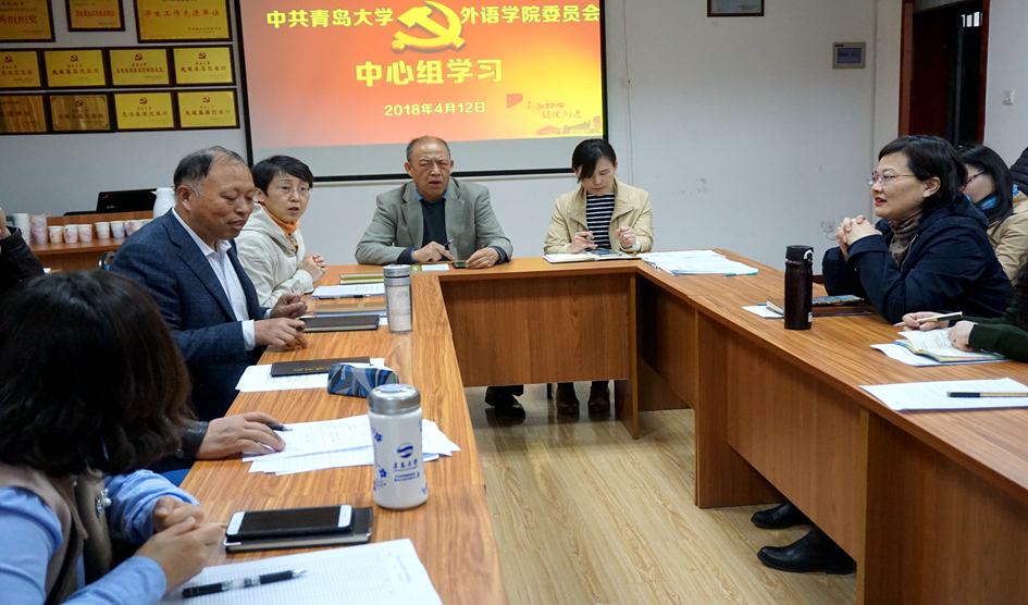 会上,吴绍新书记传达了校党委中心组(扩大)理论学习会上《高举旗帜 维护核心》的辅导报告精神,并带领全体同志深入学习了校党委书记胡金焱在学习会上作的《如何理解中国特色社会主义进入新时代这一新的历史方位》总结讲话。他号召全体教职工人心思进,要做到将学习贯彻十九大精神与学院实际工作相结合,严格按照学校党委、行政有关要求,努力做到“新时代必须有新的气象和新的作为”;要有强烈的危机感,做好学科顶层设计,围绕学科成长和学术发展重视社会参与度,在服务青岛新旧动能转换中发出外语学科的声音。