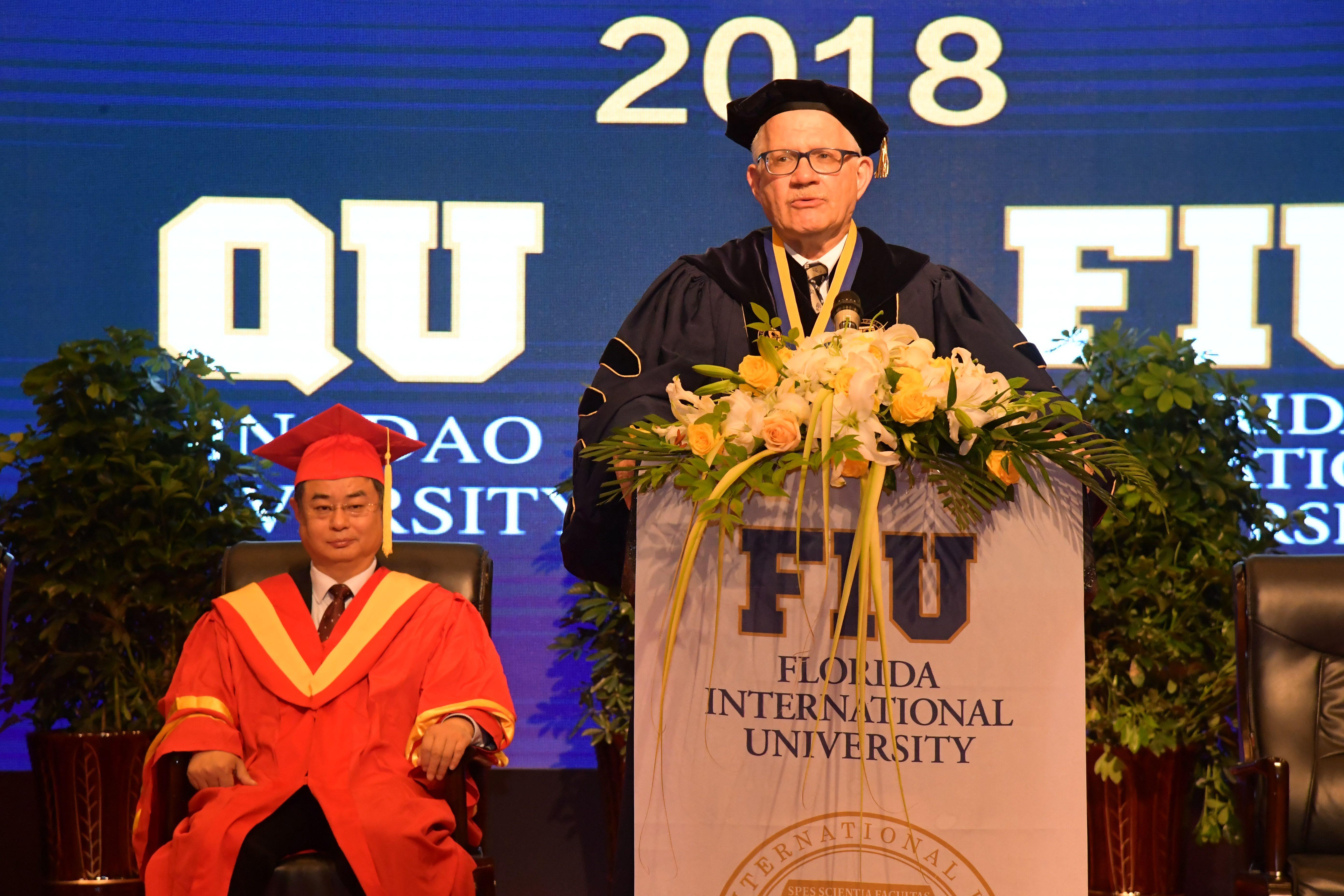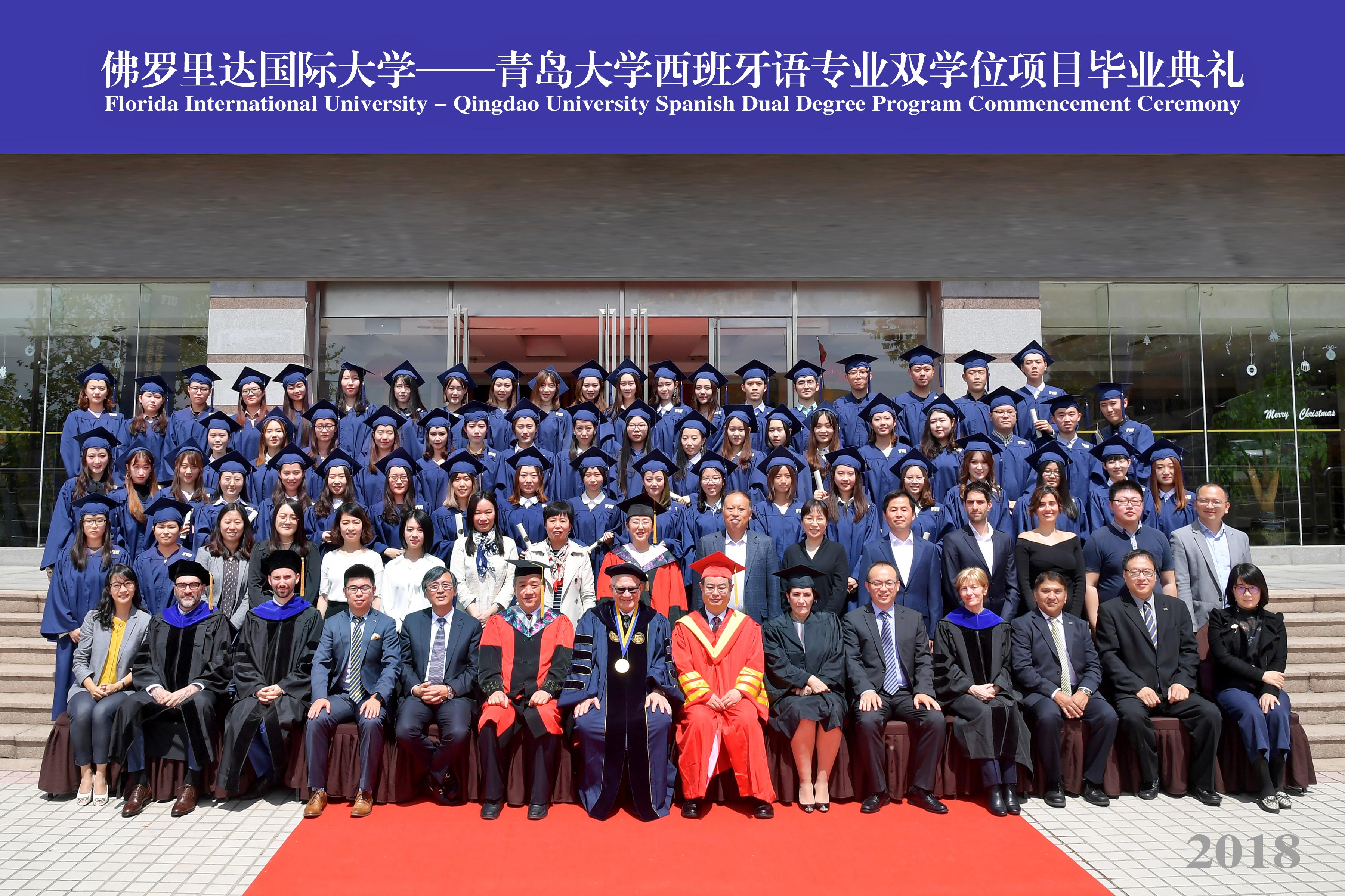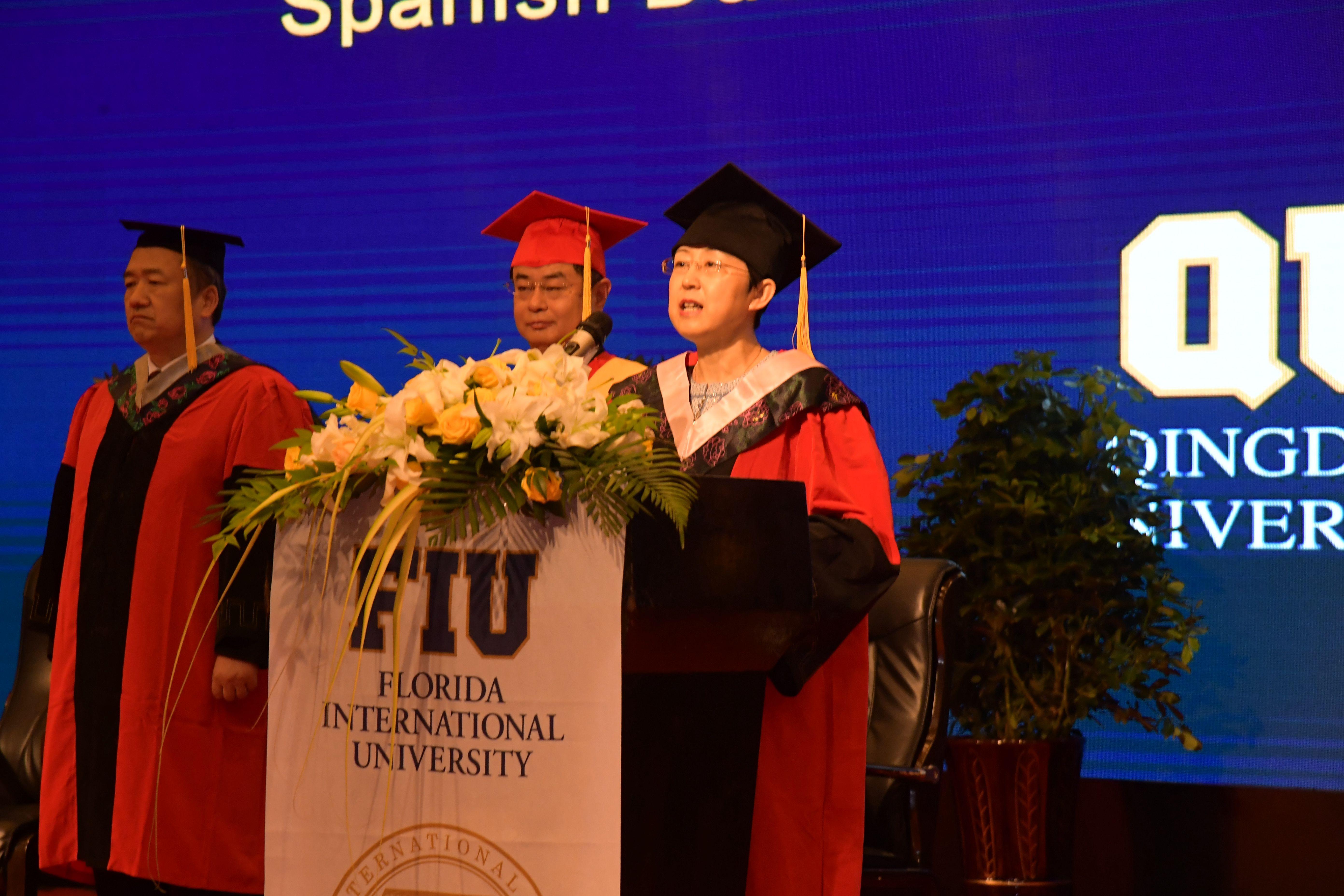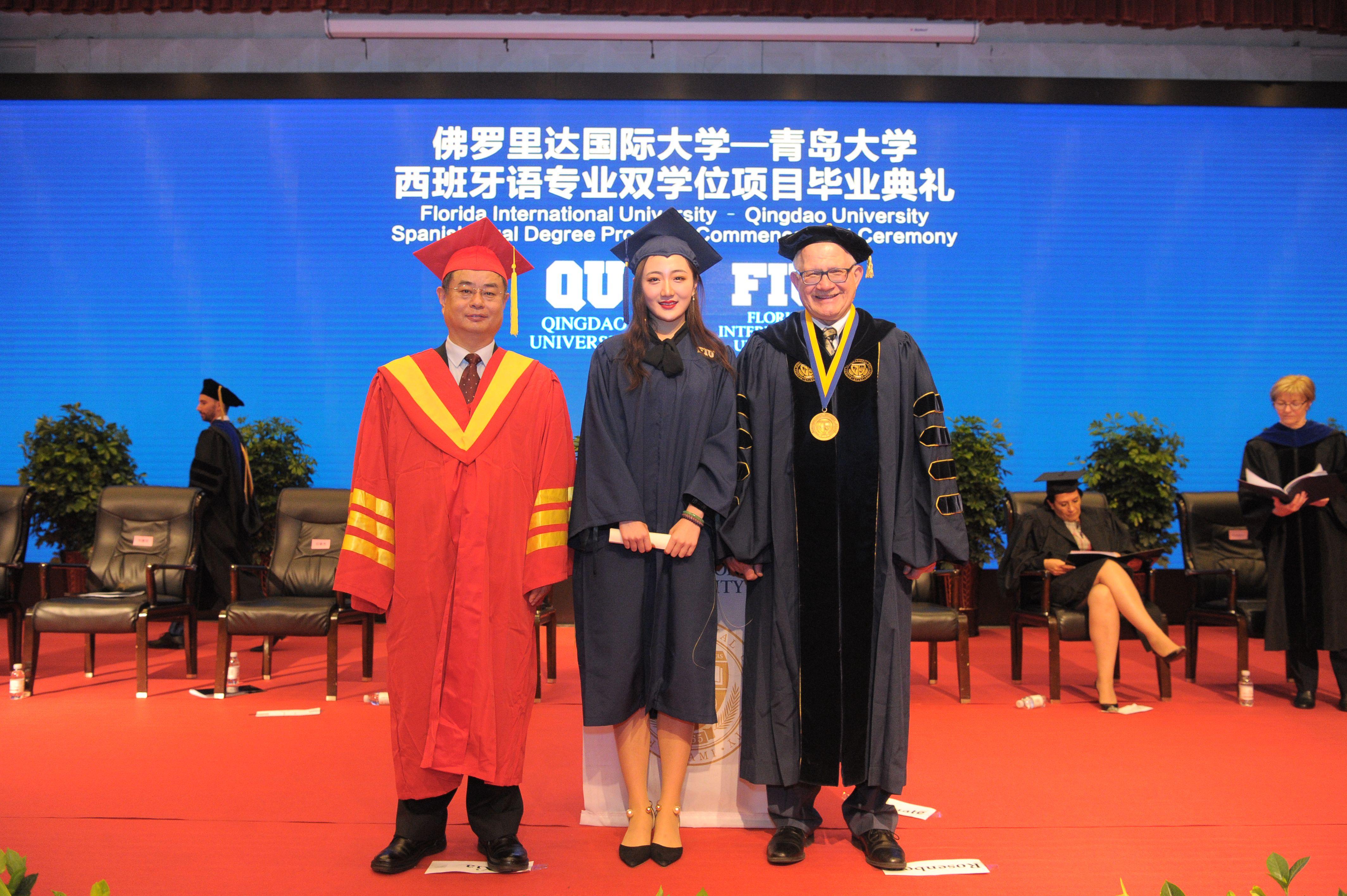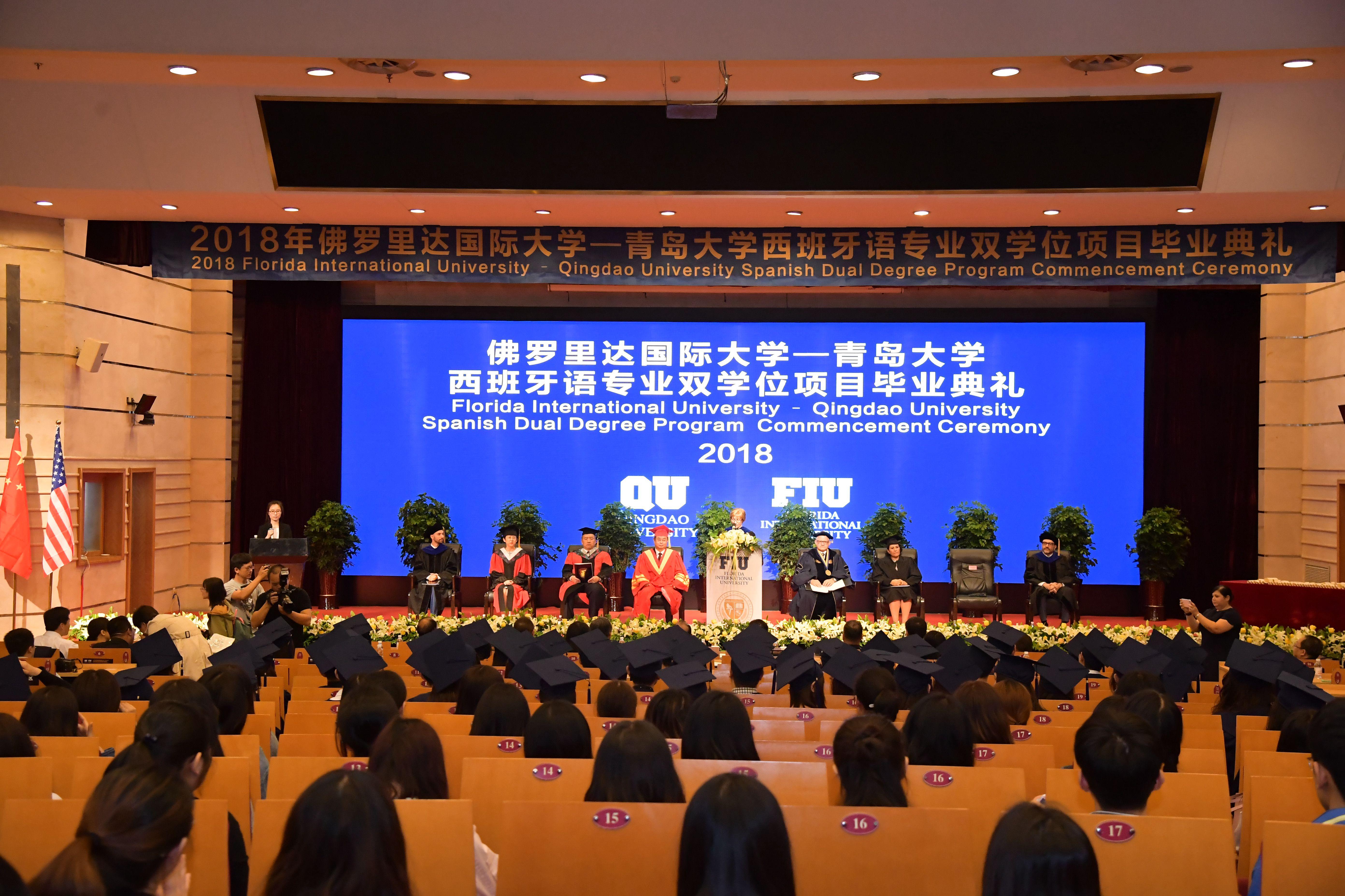 5月8日上午,佛罗里达国际大学-青岛大学西班牙语专业双学位项目毕业典礼暨美方学位授予仪式,在国际学术交流中心博学厅举行。校长夏东伟,佛罗里达国际大学校长Mark Rosenberg出席典礼并致辞。校党委副书记仪垂杰,青岛市政府外事办主任牟俊典,青岛市委高校工委副书记、市教育局党委副书记车景华,青岛市商务局副巡视员徐健,海信集团副总裁、海信国际营销公司董事长林澜,海尔集团电器产业有限公司总经理、青岛海永顺新能源科技有限公司董事长孙永乐出席典礼。青岛大学外语学院院长卞建华作为大典礼官主持开场式。