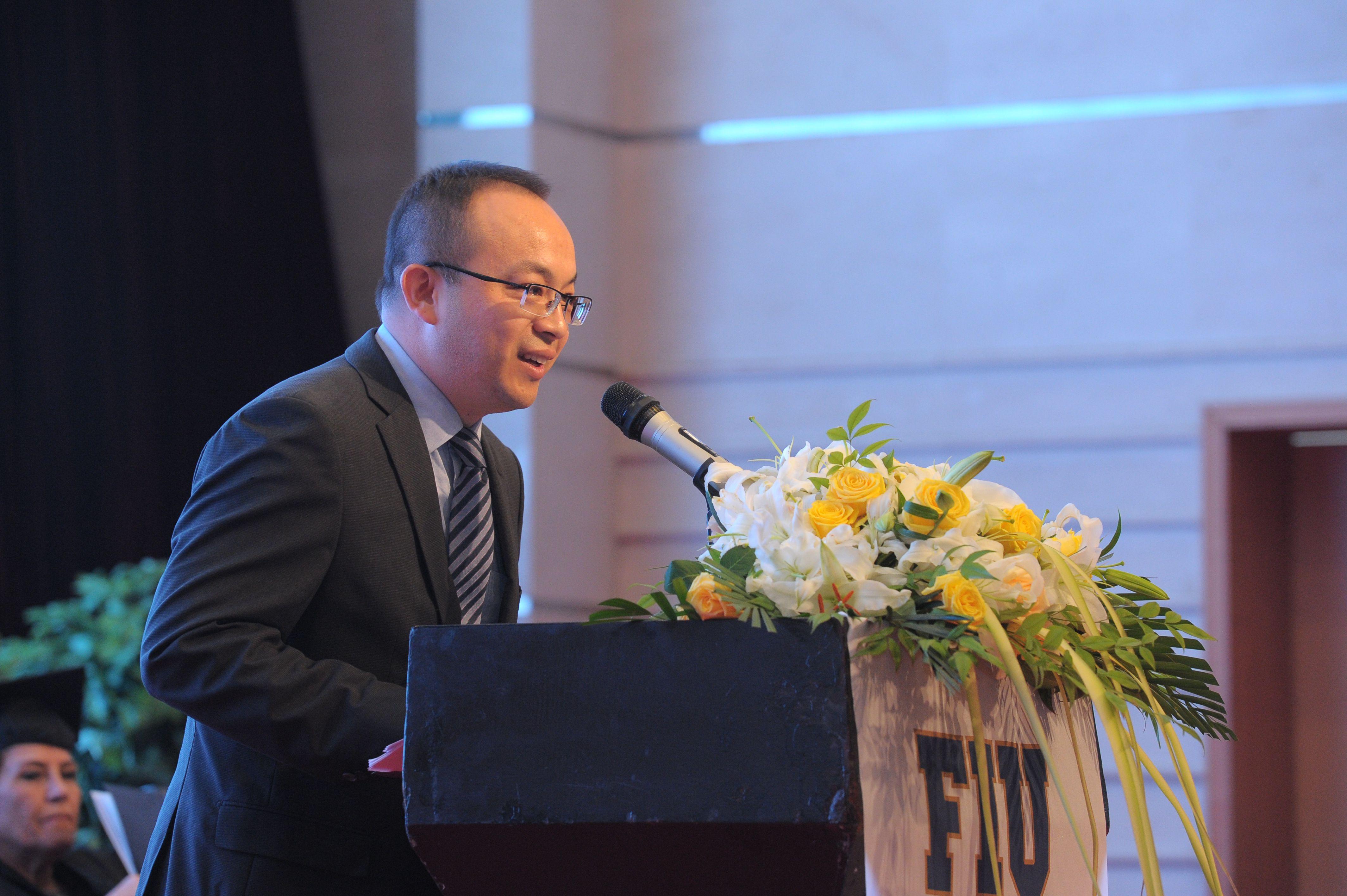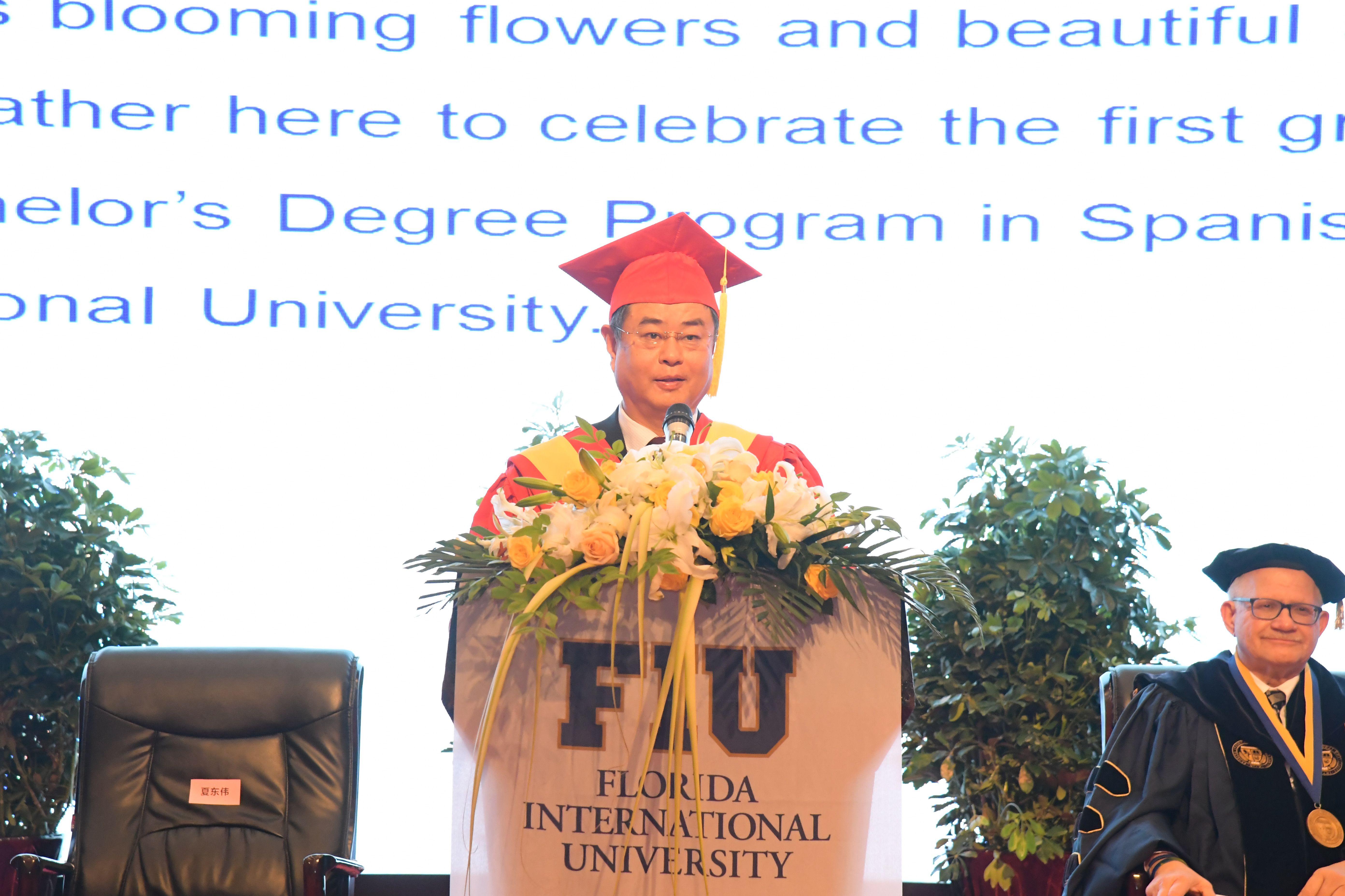 夏东伟在致辞中简要介绍了双方联合举办西班牙语专业(拉美贸易方向)本科双学位教育项目的发展情况,向佛罗里达国际大学、向为学生们成才付出辛勤劳动的双方教职员工和家长亲友们表示感谢;向圆满完成学业的毕业生们表示祝贺。他对毕业生们提出四点希望:一是坚守与时代同脉的高远理想。二是永葆与时代同行的家国情怀。三是练就与时代同进的综合素养。四是争做世界文化交流的推动者。发挥专业所长,做中华文化的传播者、世界文化交流的推动者,为建设人类命运共同体的伟大梦想贡献自己的力量。
