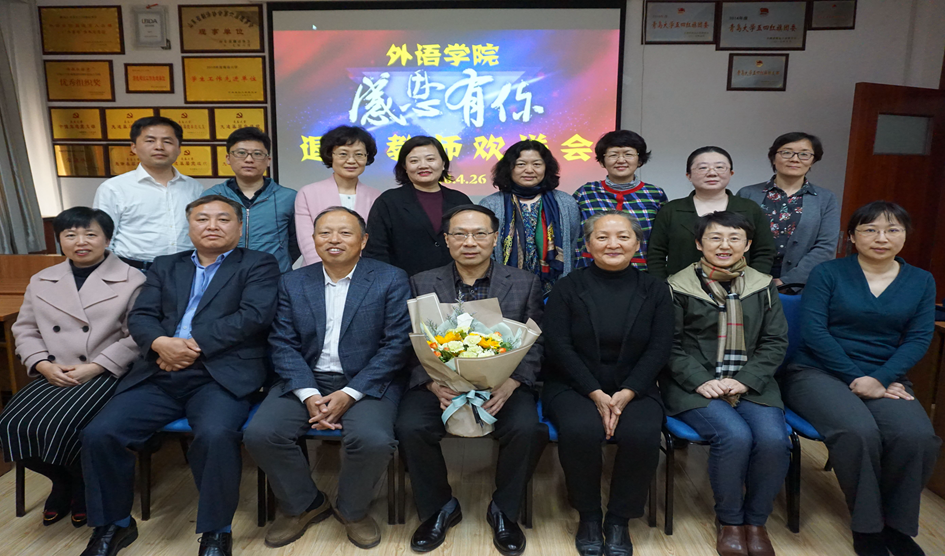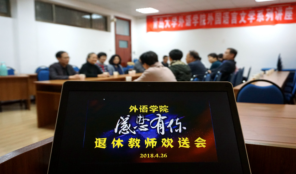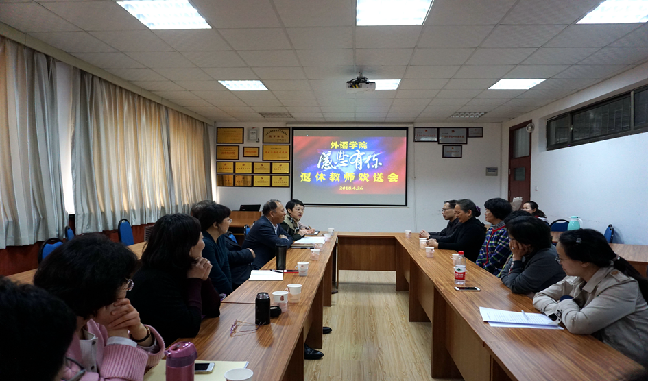 4月26日下午,学院在博文楼312会议室举行2018年退休教师欢送会。英语系退休教师张铭涧教授,学院党政领导班子全体成员,各系部分教师代表以及各办公室负责人参加座谈。卞建华院长主持欢送会。
