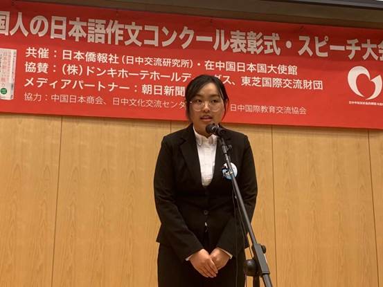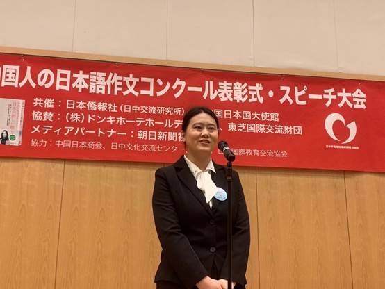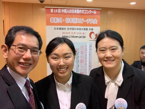 12月12日,“第14届全中国日语作文大赛”颁奖大会在北京日本驻华大使馆隆重举行,一等奖获得者我院日语系2014级学生邰华静及指导教师张科蕾出席了大会。邰华静就获奖作文进行了演讲并发表获奖感言,张科蕾老师分享了指导心得。在颁奖大会上,日语系被授予“园丁奖”并获赠图书。