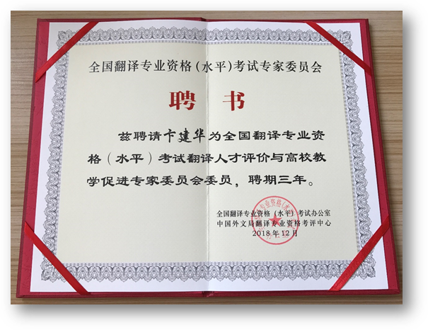12月12日,由国家人力资源和社会保障部、中国外文局主办的“全国翻译资格考试专家委员会换届大会”在北京召开。英、法、日、俄、德、西班牙、阿拉伯七语种专家委员会委员和翻译人才评价与高校教学促进委员会专家及全国翻译资格考试办、外文局考评中心等单位相关人员共150余人参加会议。我院院长卞建华教授入选新一届全国翻译专业资格(水平)考试专家委员会,受聘为翻译人才评价与高校教学促进专家委员会委员。