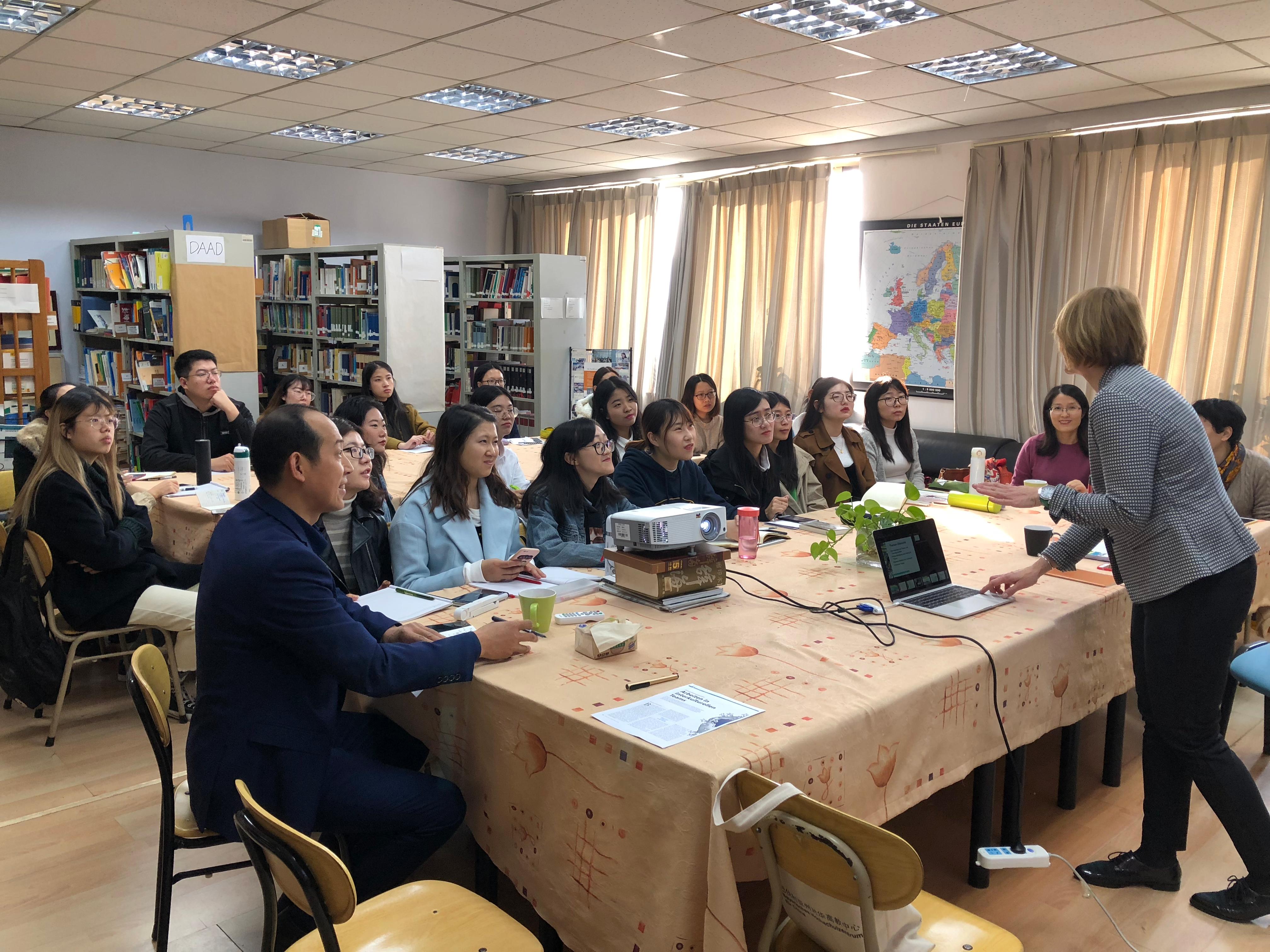 11月12日上午,德国哥廷根大学跨文化能力培训中心主任Alexandra Schreiber女士应山东省中德高校合作中心和我院邀请,来校参加“跨文化团队:面对面及虚拟交际与合作”研讨会。与我院德语系、山东农业大学、青岛科技大学、青岛理工大学琴岛学院共三十余名德语学科师生进行研讨交流。