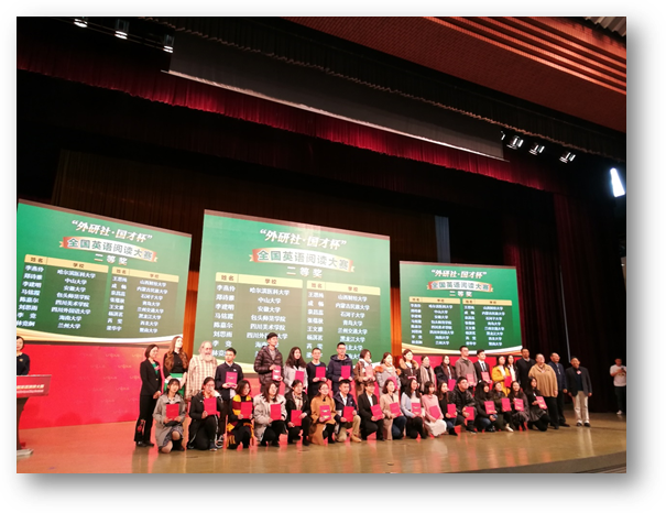 12月9日上午,大赛组委会公布获奖名单,并在北京外研社国际会议中心千人礼堂举行颁奖仪式。我校外语学院2016级中外英语专业张蕴秋同学喜获全国英语阅读大赛全国总决赛二等奖。同时,外语学院英语三系指导教师王进福获得优秀指导教师称号。