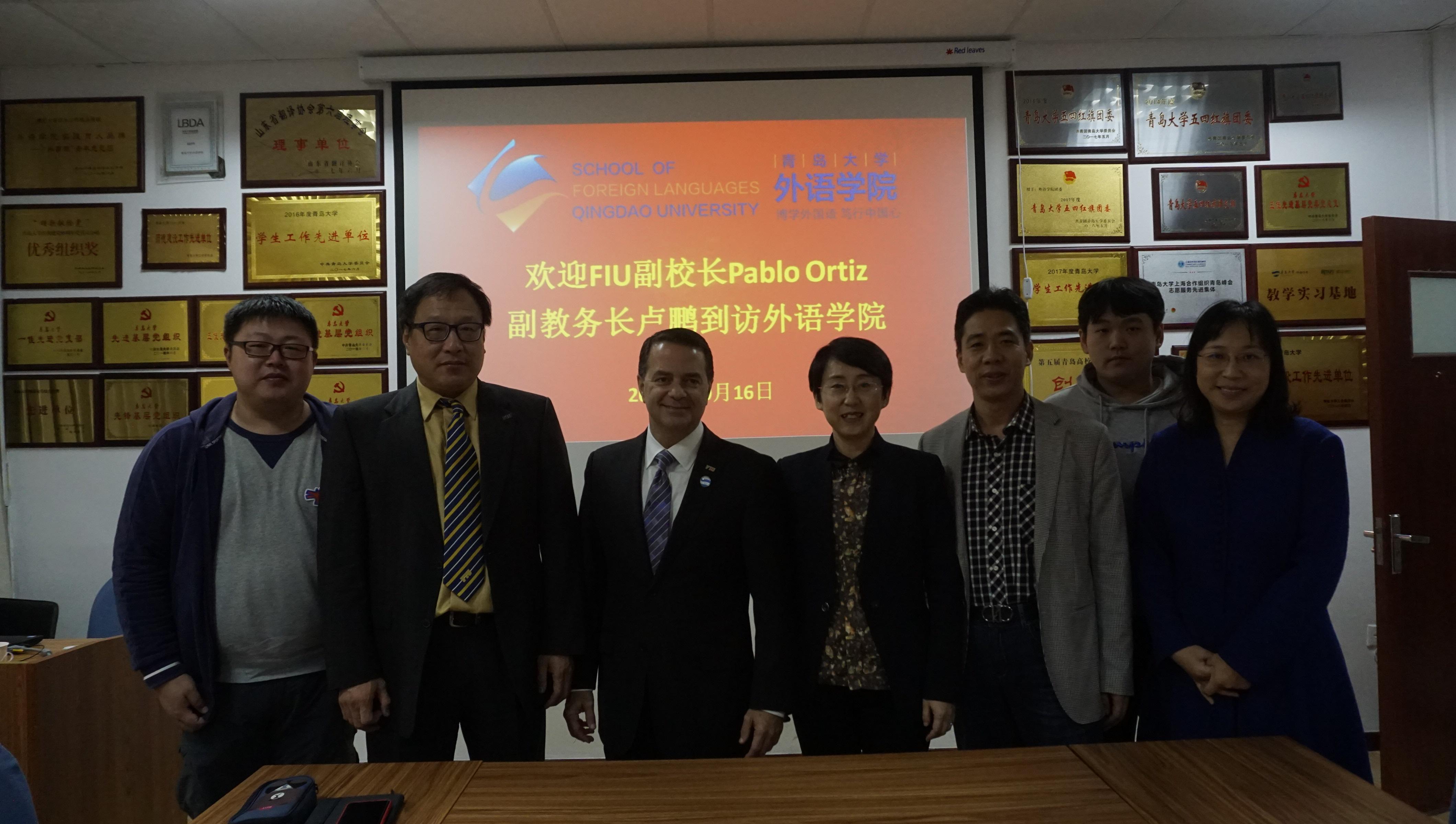 10月16日下午,FIU副校长Pablo Ortiz先生、FIU副教务长卢鹏到外语学院访问交流。学院党委书记王传永,院长卞建华,副院长宫英瑞,英语教育系主任秦硕谦,西班牙语系副主任栾勋业,外事助管范文楚参加座谈。