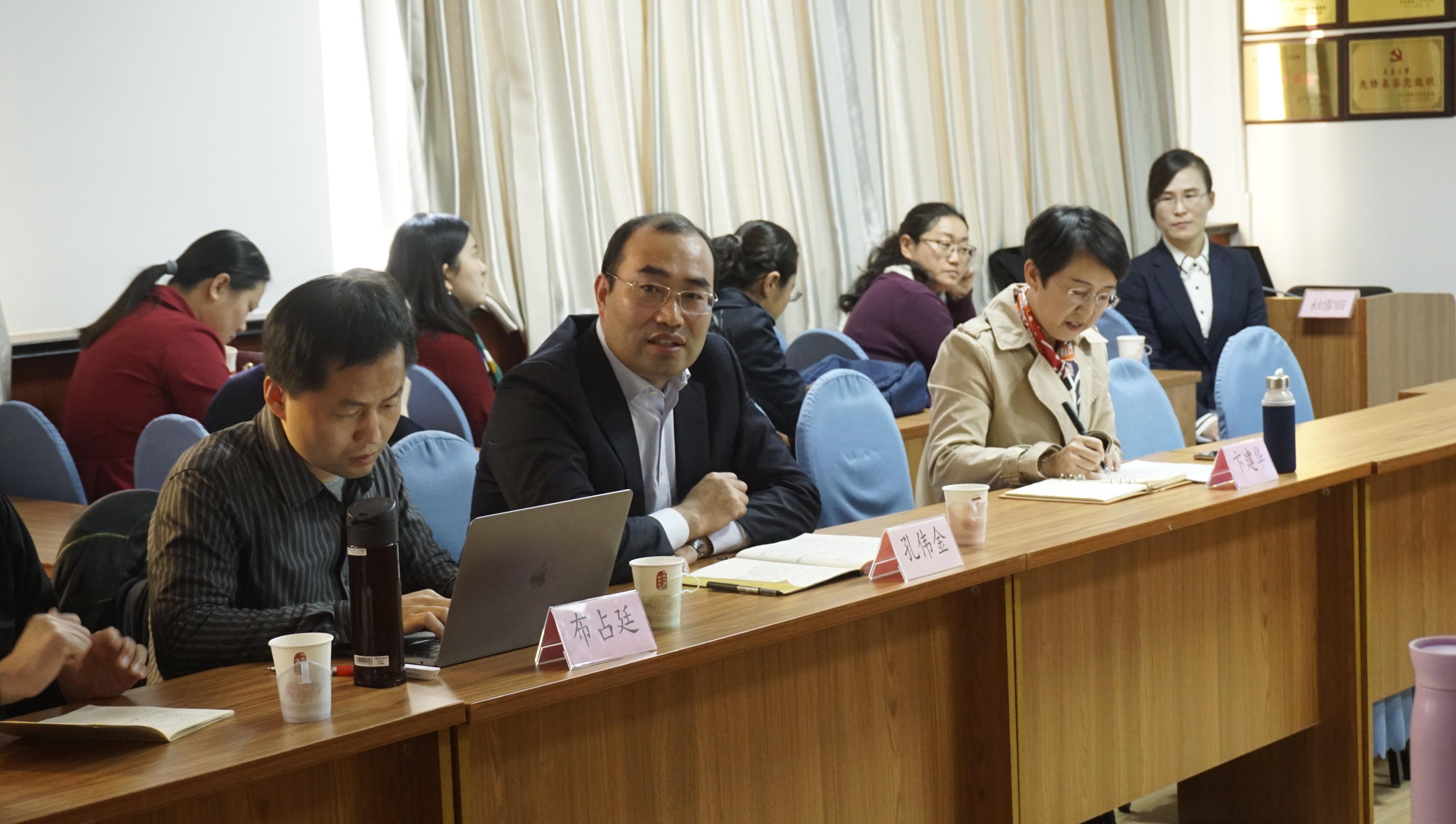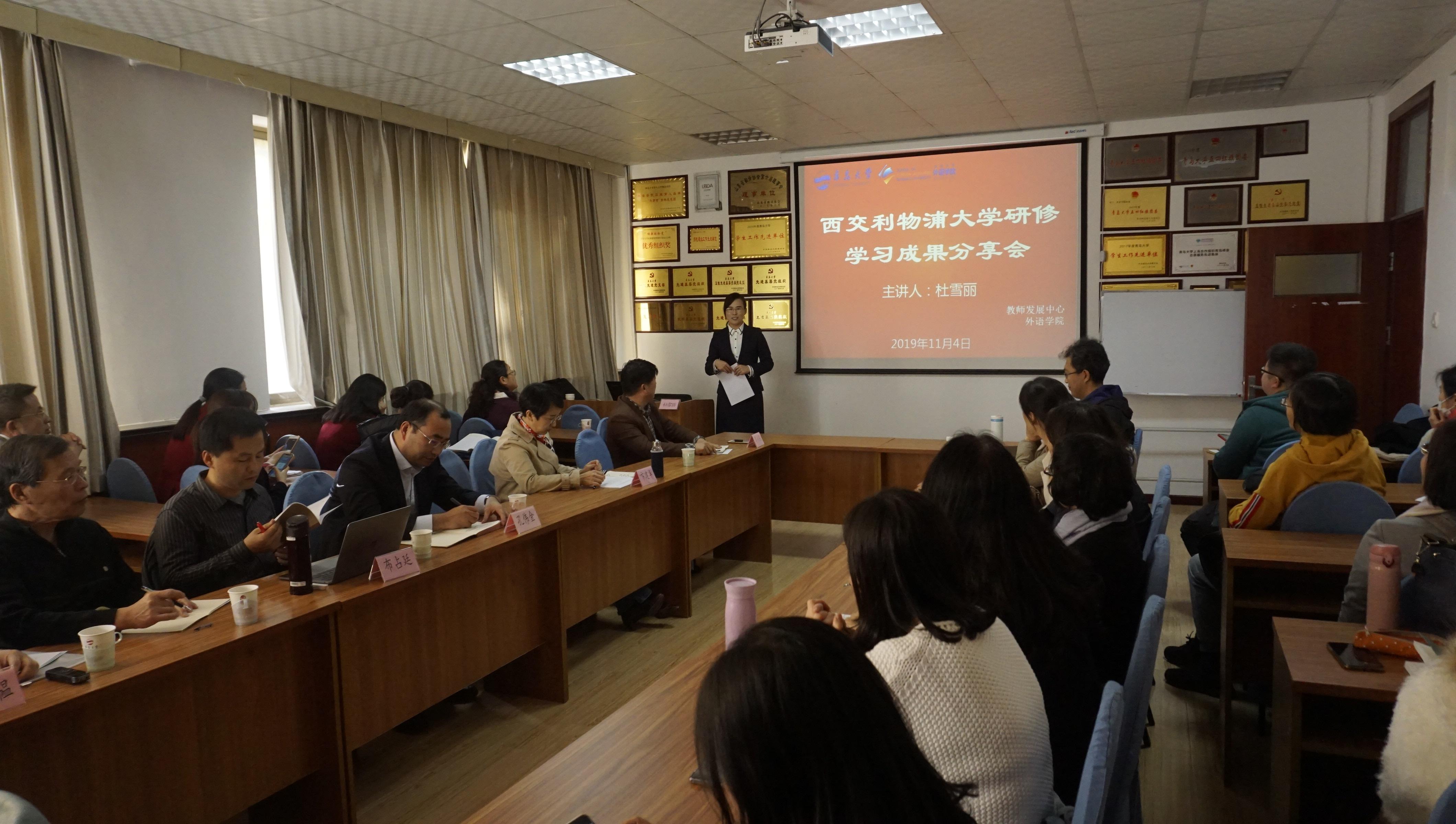 11月4日下午,外语学院与教务处教师发展中心联合举办的赴西交利物浦大学研修学习成果首场分享交流会在博文楼312会议室举行,外语学院杜雪丽老师进行了成果分享。青岛大学党委常委、副校长孔伟金,学校督学周东明教授,原图书馆馆长、物理科学学院党委组织员房运琦,教务处教师发展中心主任沈香韫,外语学院院长卞建华,副院长布占廷、娄永强及外语学院和其他学院的教师代表参加了这次交流会,会议由娄永强主持。