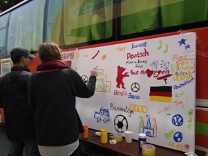 大篷车“来德语吧”橙色巴士驶入青大