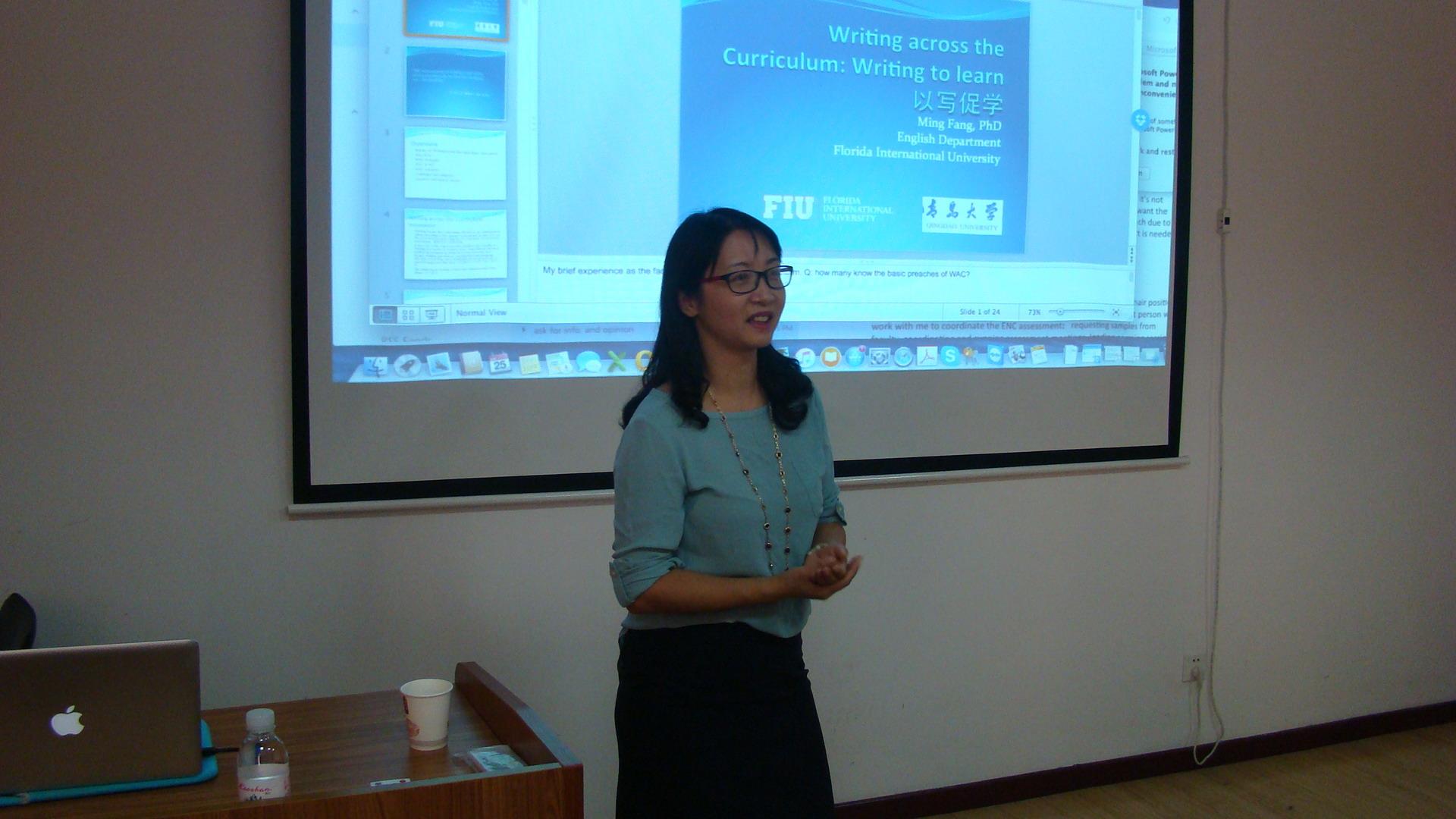此外,方明博士还为我院师生做了题为“Writing Across Curriculum : Writing to Learn 以写促学”的专题学术讲座,介绍美国大学课程学习中写作的重要性和教学实践中以写促学的理念,并通过展示各类学科以写促学习的实例,探讨以写促学的意义、具体方法及挑战。