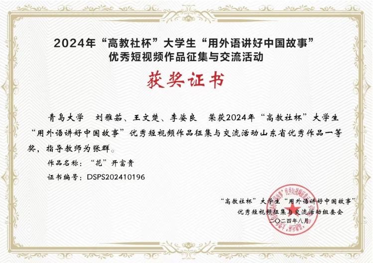 近日,由中国英汉语比较研究会主办、南京大学、湖南大学联合高等教育出版社共同举办的2024年“高教社杯”大学生“用外语讲好中国故事”优秀短视频作品征集活动公布获奖名单。青岛大学外语学院英语系张群老师指导、刘雅茹、王文楚、李姿良同学的团队作品《“花”开富贵》脱颖而出,荣获山东省一等奖。