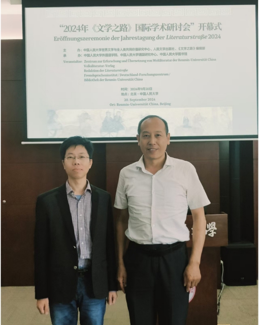 9月19日至9月22日, 2024年《文学之路》国际学术研讨会在中国人民大学成功召开。作为《文学之路》创刊以来所举办的第二十届年会,本次会议以“德语文学和语言中的家乡”为主题,由中国人民大学世界文学与全人类共同价值研究中心、人民文学出版社、《文学之路》编辑部主办,中国人民大学外国语学院、德国研究中心与中国人民大学图书馆联合承办。共吸引来自中国、德国、奥地利、以色列和韩国46所高校与科研院所的共计130余名日耳曼学者前来参会。青岛大学外语学院德语系主任綦甲福教授、德语系副系主任王学博老师受邀参会。
