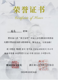 10月26日,第八届郑芝溶杯中国大学生韩国语诗朗诵大赛决赛在杭州师范大学举行。经过一天激烈的角逐,我院朝鲜语系22级学生曾茹月、池天慧喜获二等奖,朝鲜语系崔花老师获得优秀指导教师奖。