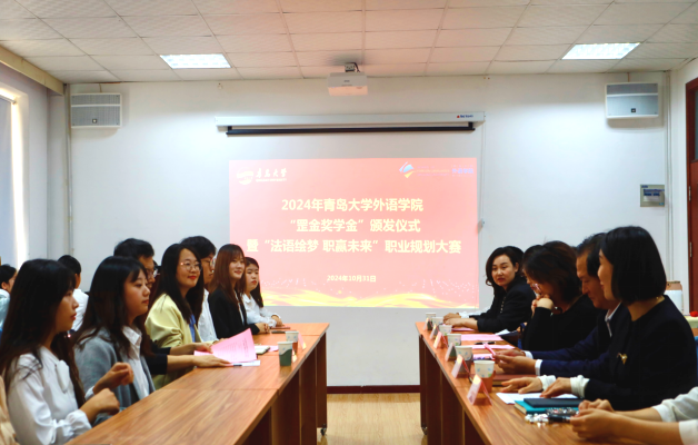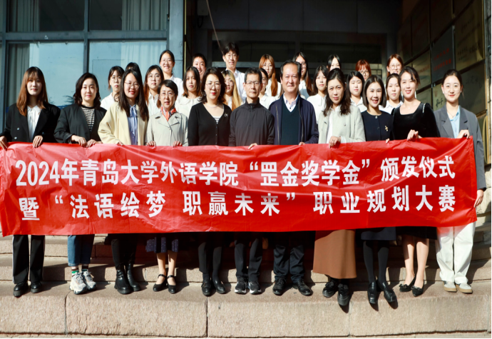 10月31日下午,外语学院2024年“罡金奖学金”颁发仪式在博文楼312教室隆重举行。青岛罡金国际合作服务有限公司总经理夏纲举,人力部副经理刘玉媛、学校合作发展处处长、校友工作办公室主任王海荣,学生工作处副处长郭纳,外语学院党委书记陈崇研、院长卞建华、党委副书记于苗、法语系主任段丽君等领导共同出席仪式。仪式由外语学院党委副书记于苗主持。