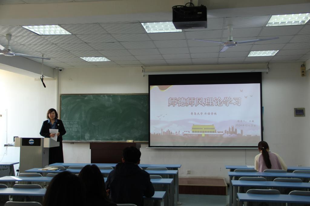 王薇副院长强调了教育创新的重要性,并带领全体教师学习优秀的师德师风,提出“高质量的教师,才能培养出高质量的学生”。她呼吁教师们通过互相学习和共同进步,持续提升教学水平,并注重培养良好的师德,推动外语学院教育质量的提升。