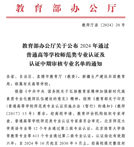 近日,教育部办公厅正式发布了《教育部办公厅关于公布2024年通过普通高等学校师范类专业认证及认证中期审核专业名单的通知》(教师厅函〔2024〕20号)。青岛大学师范英语专业顺利通过了中学教育第二级认证,认证有效期为六年。