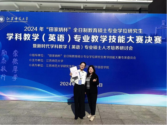 11月8-10日,全国“田家炳杯”全日制教育硕士专业学位研究生学科教学(英语)专业教学技能大赛决赛在江苏师范大学举行。我院学科教学(英语)2023级研究生张文馨荣获三等奖,指导教师为秦硕谦和布占廷。